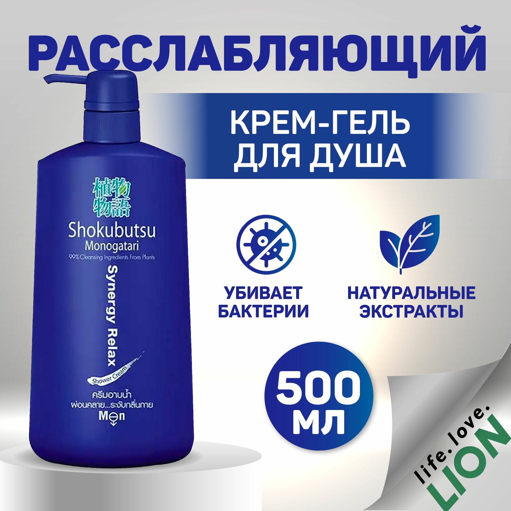 LION Крем-гель для душа мужской Shokubutsu расслабляющий с экстрактом водорослей / японские технологии / с дозатором, 500 мл
