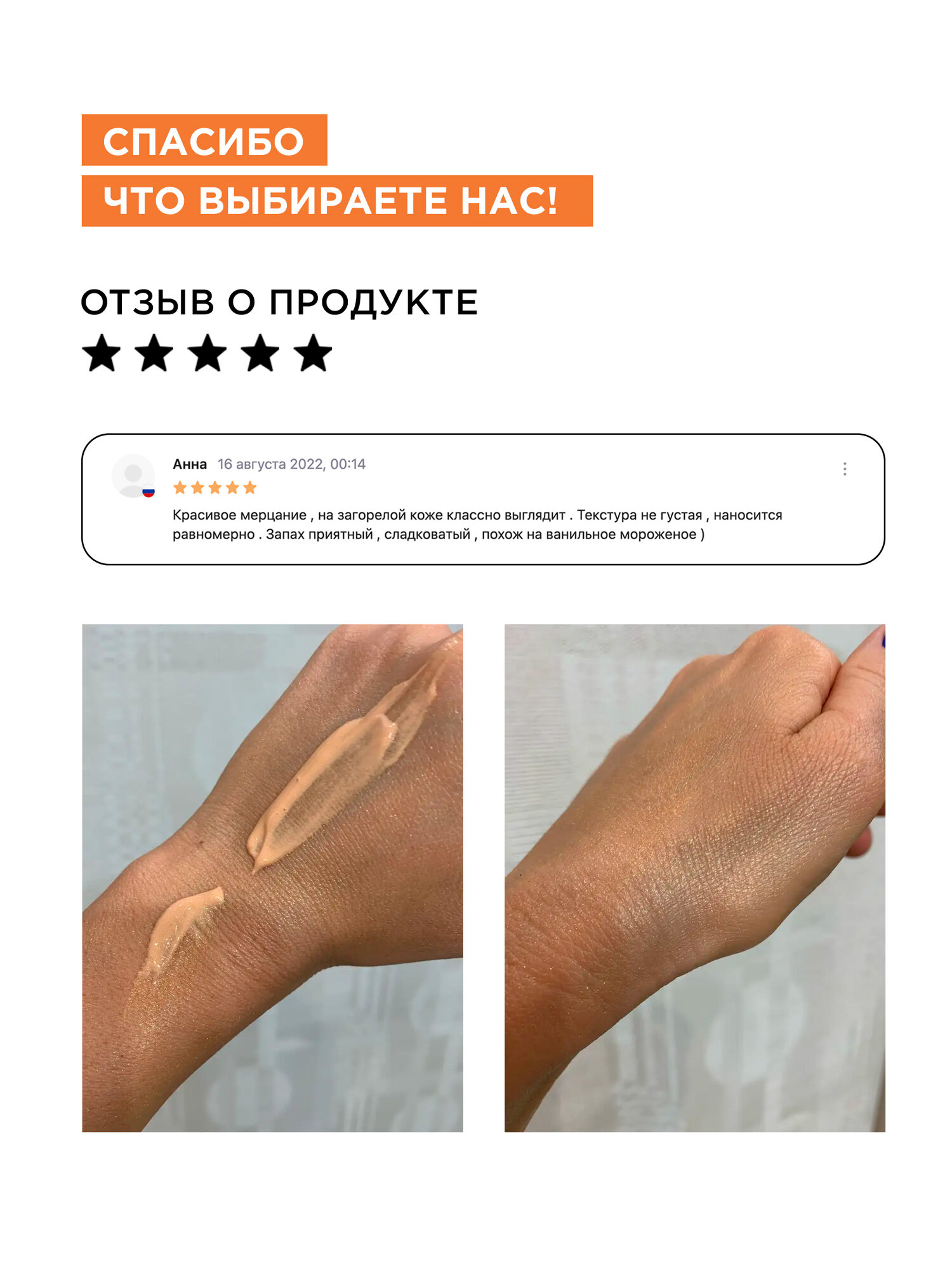 | Способ применения | хорошо встряхнуть флакон, нанести шиммер на чистую и сухую кожу массажными движениями |