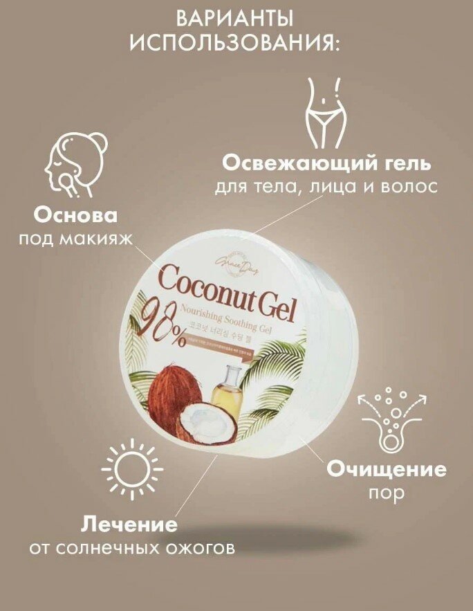 СохранитьГель для лица, тела и волос универсальный Grace Day с экстрактом кокоса, Увлажняющий и успокаивающий для всех типов кожи, Корейская косметика 300 мл. интересное:
