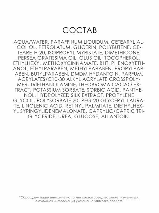 | Состав | water, paraffinum liquidum, cetearyl alcohol, petrolatum, glycerin, polybutene, ceteareth-20, isopropyl myristate, dimethicone, persea gratissima oil, olus oil, tocopherol, ethylhexyl methoxycinnamate, bht, phenoxyethanol, ethylparaben, methylparaben, propylparaben, butylparaben, dmdm hydantoin, parfum (fragrance), acrylafes/c10-30 alkyl acrylate crosspolymer, triethanolamine, theobroma cacao extract, potassium sorbate, sorbic acid, panthenol, hydrolyzed silk extract, propylene glycol, polysorbate 20, peg-20 glyceryl laurate, linoleic acid, retinyl palmitate, diethylhexyl syringylidenemalonate, caprylic/capric triglyceride, urea, glucose, allantoin |