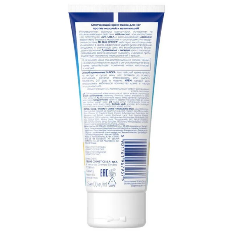 | Способ применения | толстый слой крема нанести на чистую и сухую кожу ног, оставить до полного впитывания. Остатки вмассировать или удалить. Применять 2-3 раза в неделю. КРЕМ: каждый день вмассировать небольшое количество крема в чистую и сухую кожу ног |