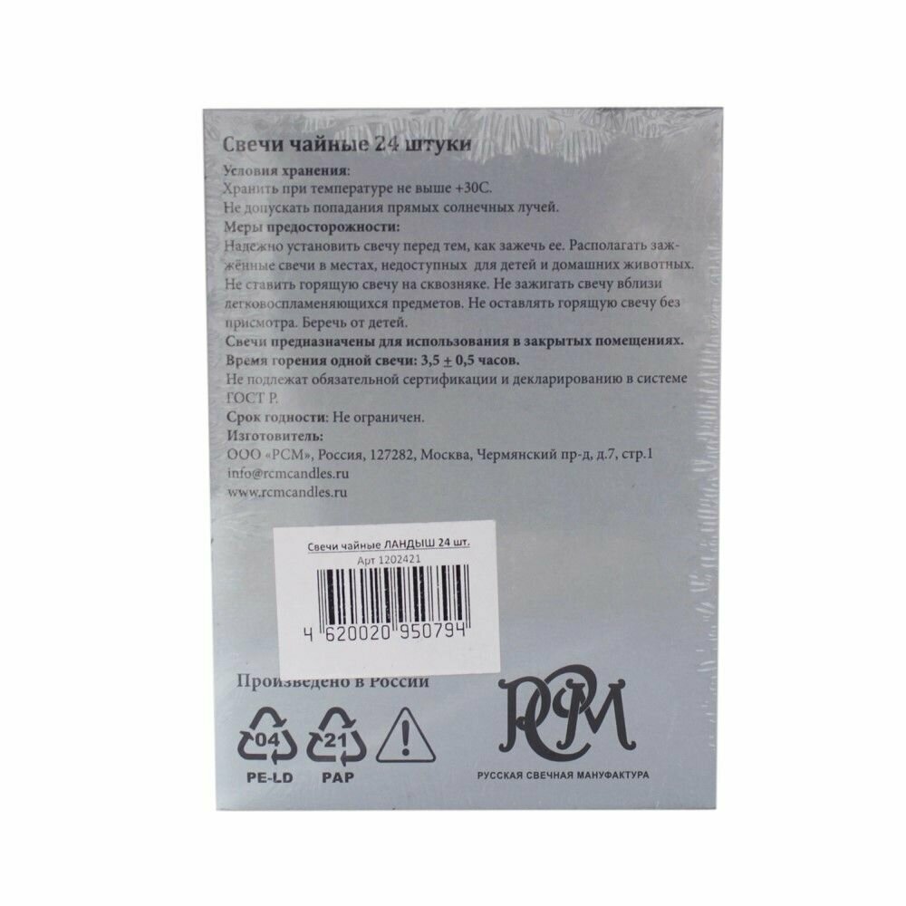 | Дополнительная информация | состав: парафин, хлопок, растительный воск; время горения одной свечи: 3.5±0.5 часов |