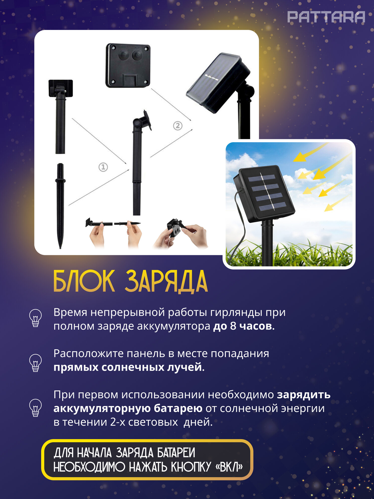 | Комплектация | Солнечная панель - 1шт, аккумуляторная батарея - 1 шт, ножка - 1 шт. |