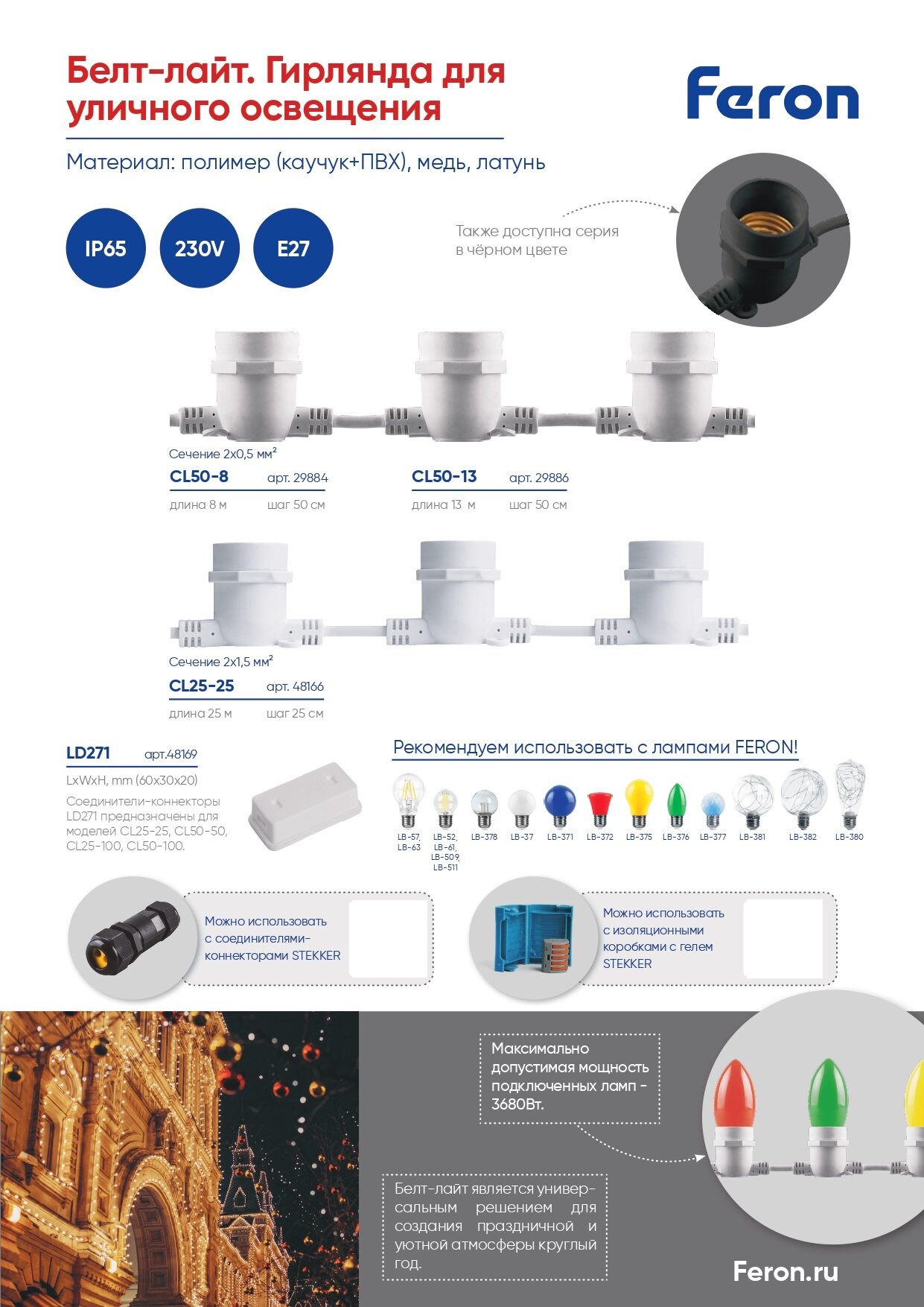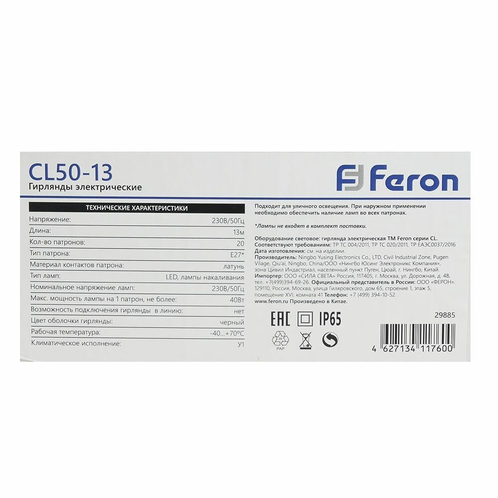 Купить Гирлянда 230V, 20 патронов, E27 белый, шаг 50cm, IP 65, 13м +3м сетевой шнур, CL50-13, Feron Белт-лайт,29886