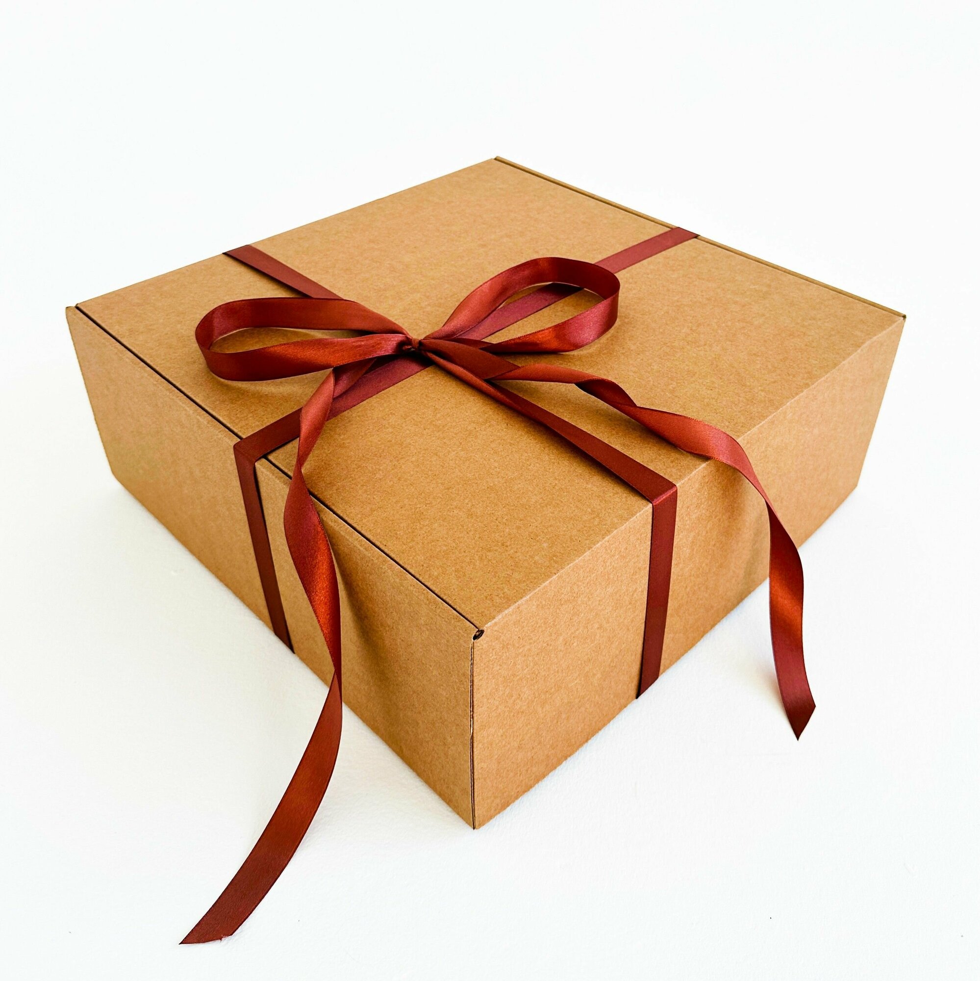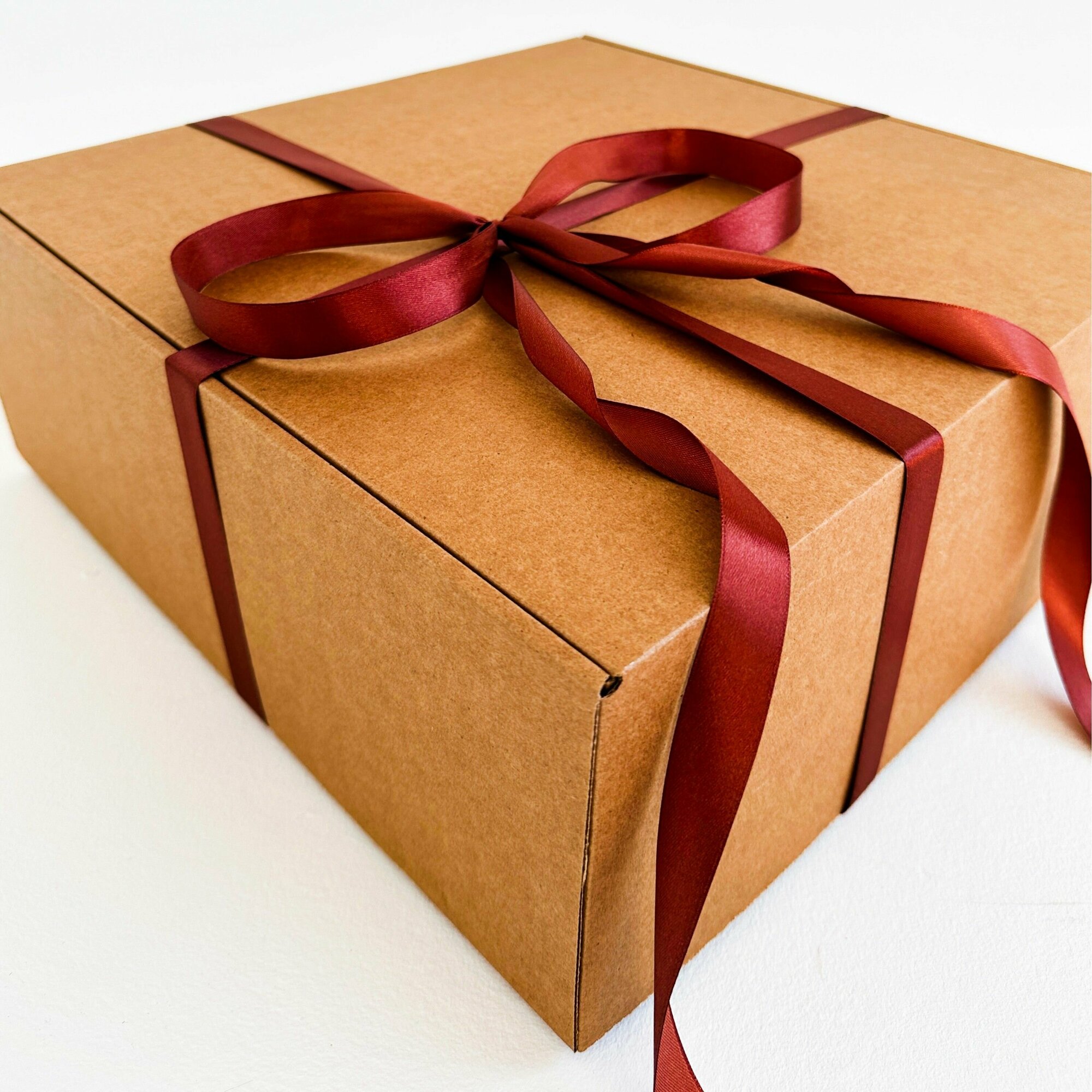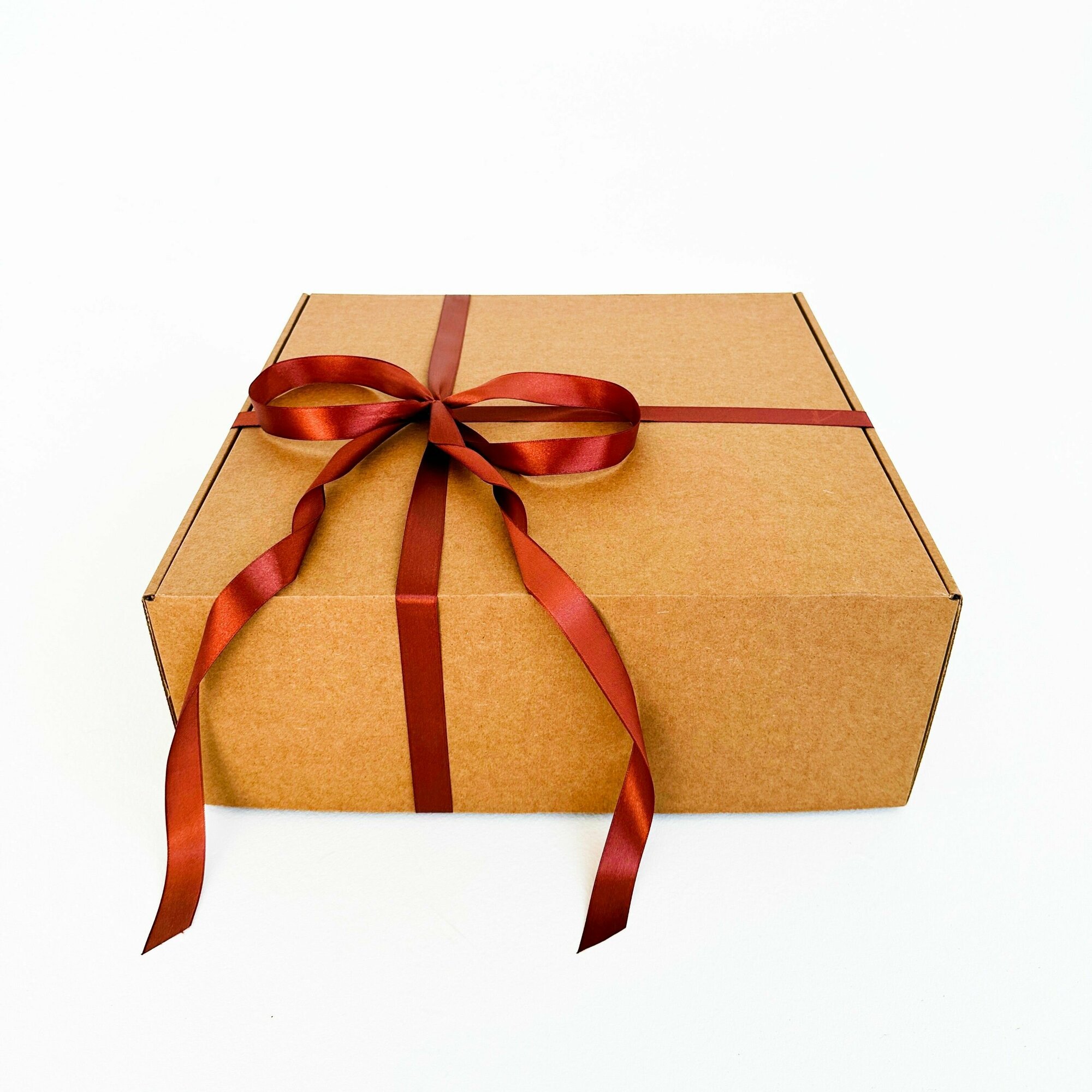 Большая подарочная коробка GILEV 37x37x14 см с бордовой лентой и наполнителем крафт
