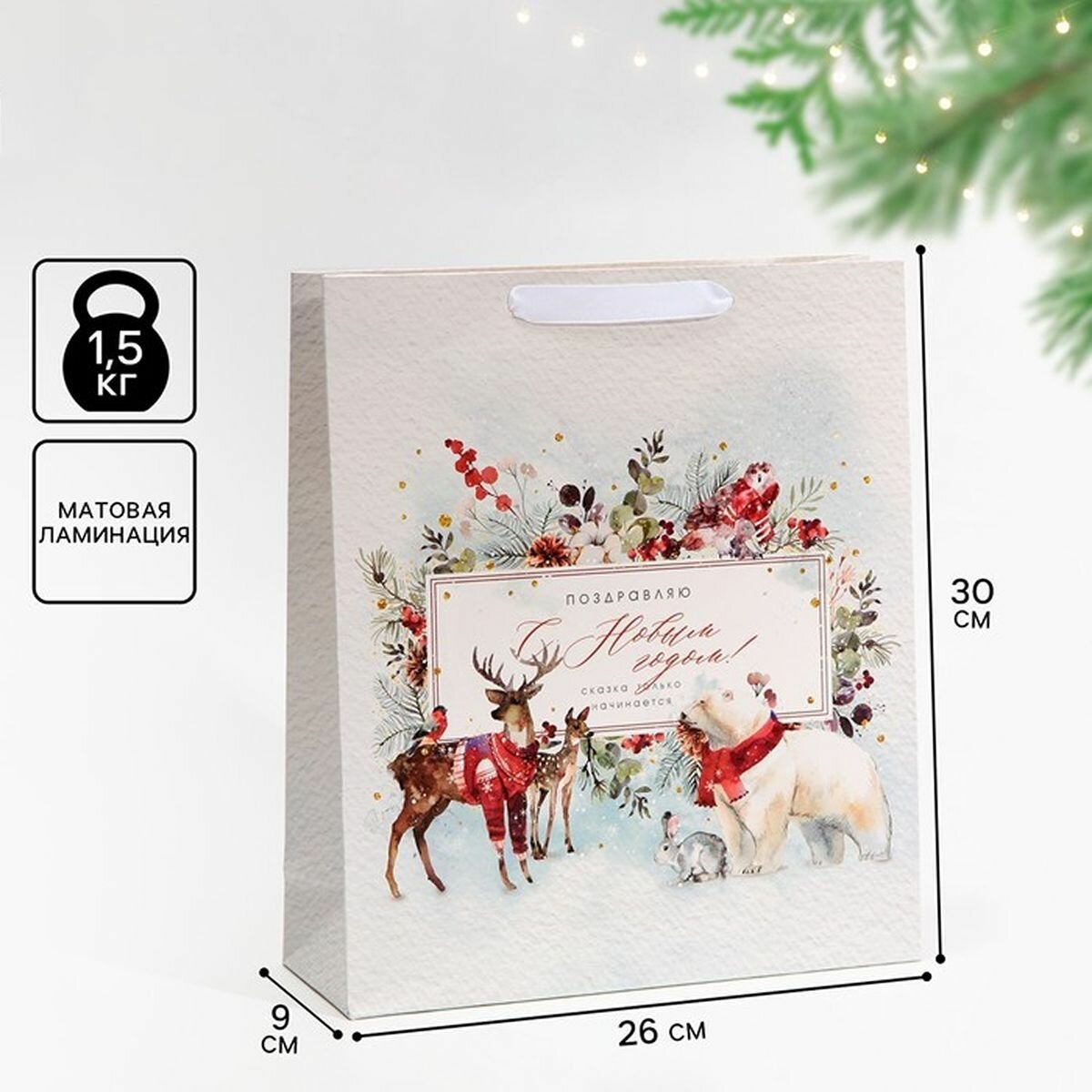Дарите Счастье Пакет подарочный новогодний ламинированный "Прогулка в зимнем лесу", M 30 х 26 х 9 см