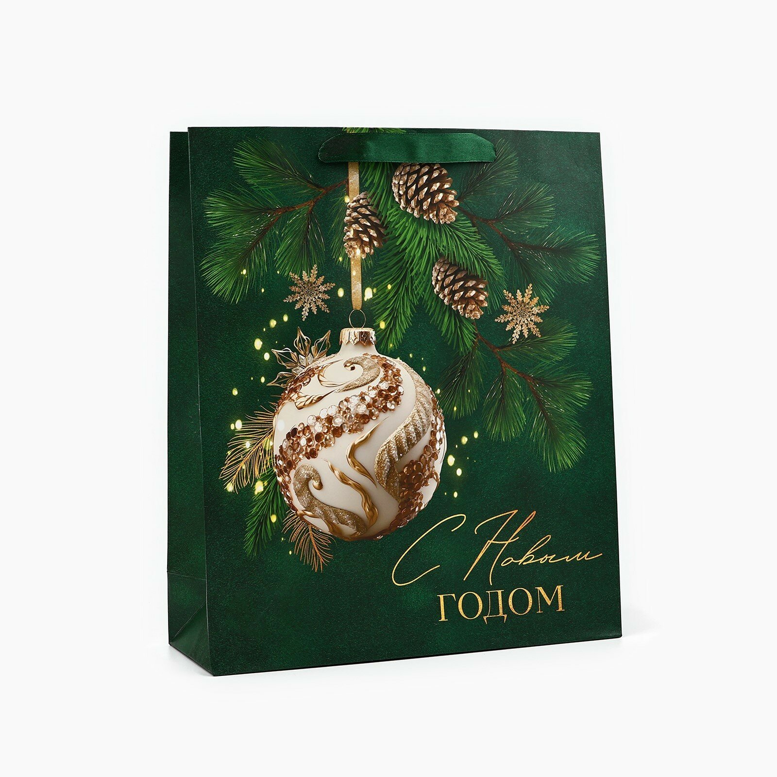 Купить Подарочный пакет новогодний ламинированный «С Новым годом», ёлочные игрушки, M 26 х 30 х 9 см, для упаковки подарка на Новый год.