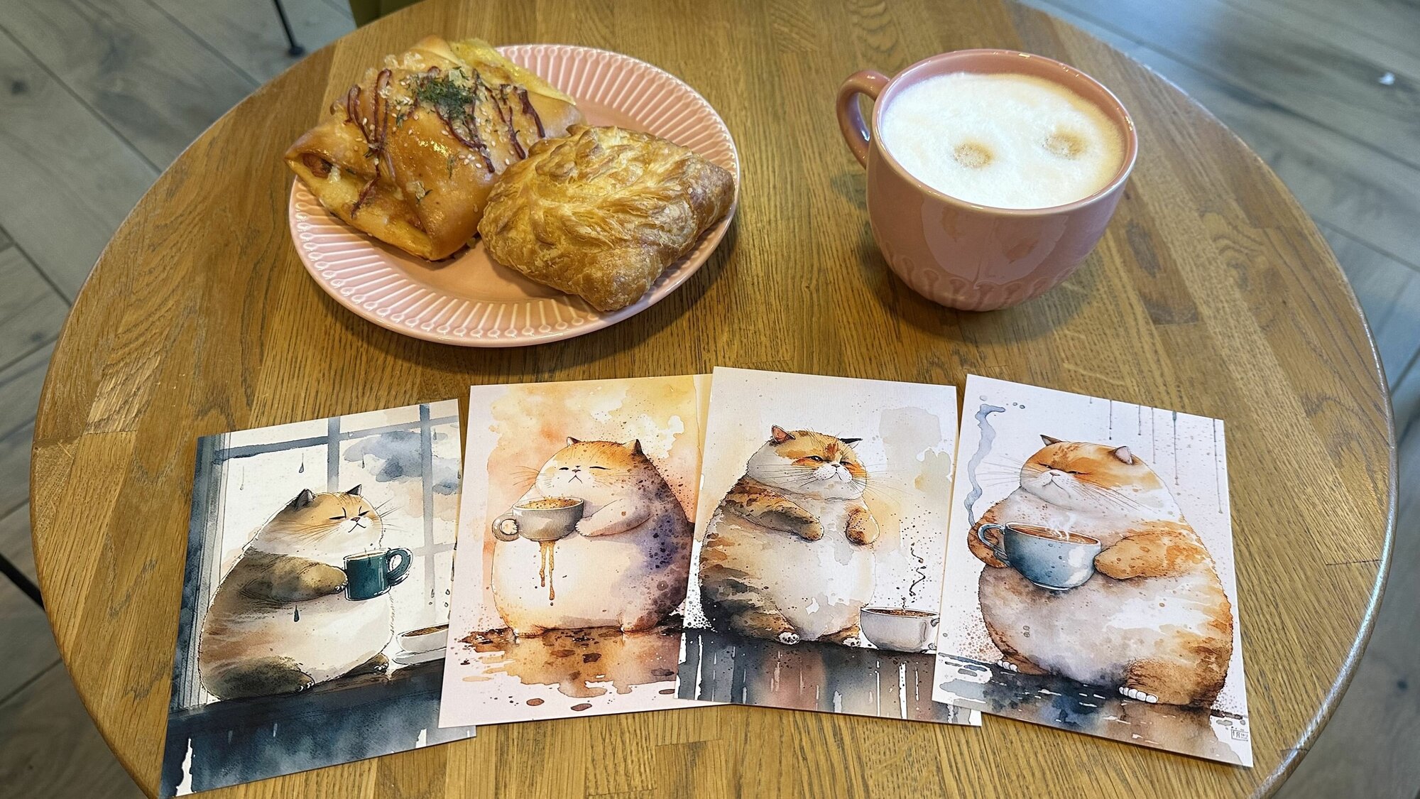Купить Кофейные Мурлыки: Утренний Аромат - 4 открытки с кофеманами-котиками для энергичного посткроссинга и поздравлений, уютные мини-постеры