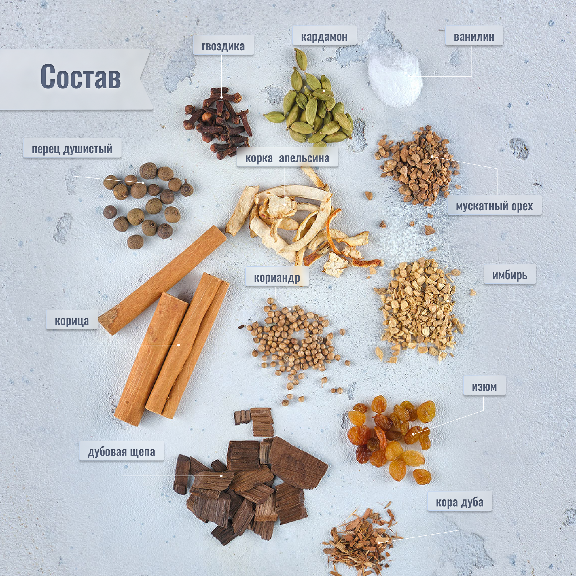 | Состав | Вишня сушеная, шиповник, гвоздика, дубовая щепа, корица, миндаль, изюм |