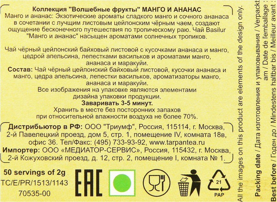 Basilur Волшебные фрукты чай черный Манго и Ананас 100гр. интересное: