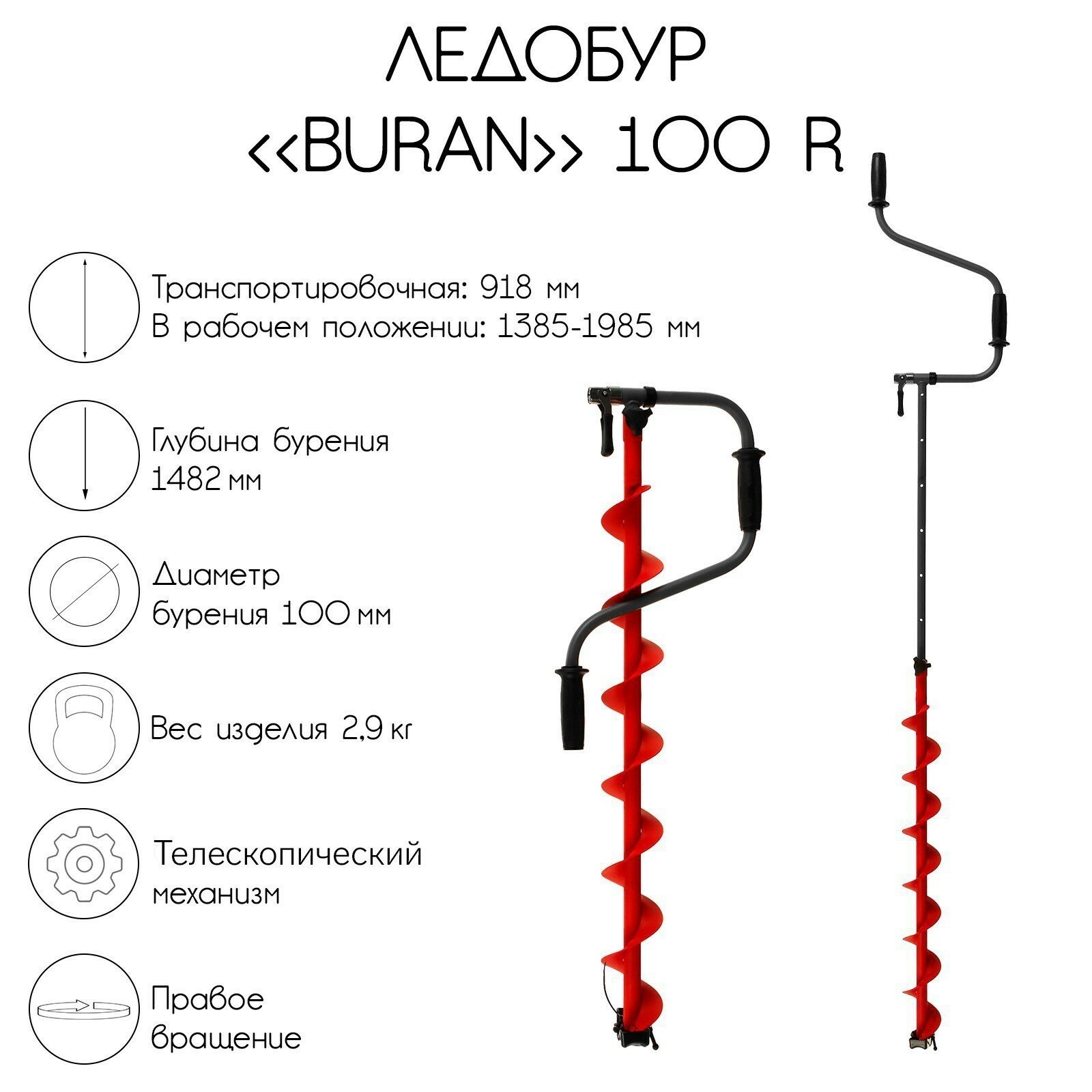 Ледобур BURAN 100R правое вращение, цельнотянутый шнек (LB-100R) Тонар