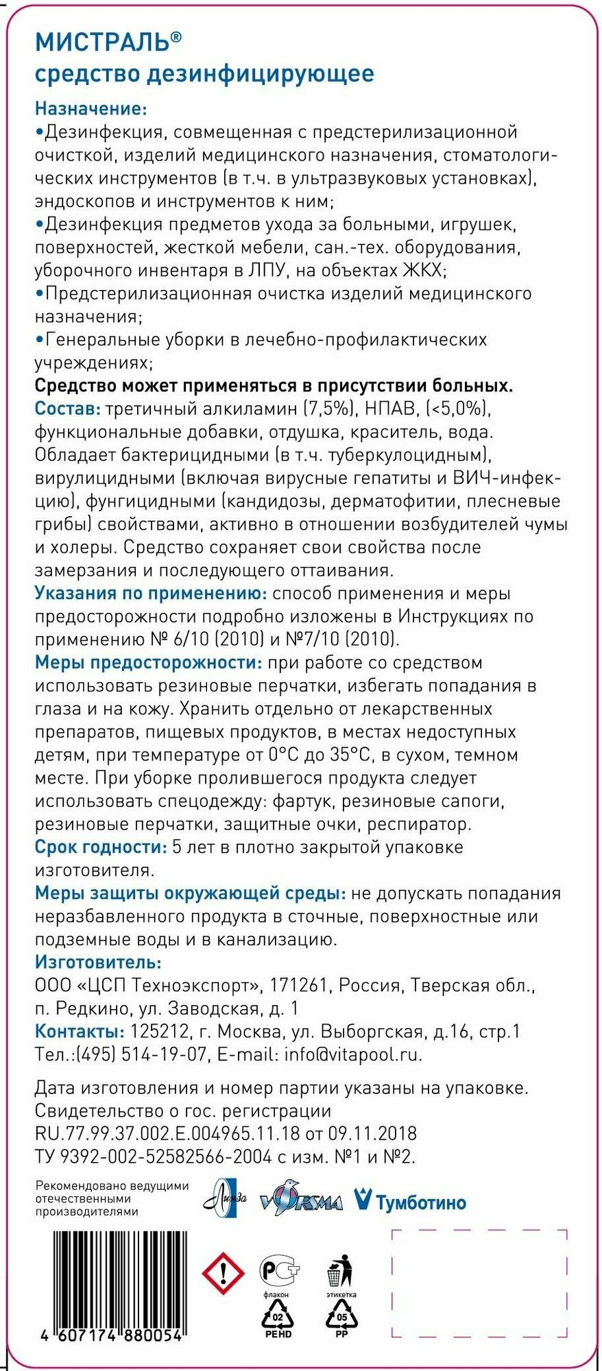 | Особые указания | при работе со средством использовать резиновые перчатки, избегать попадания в глаза и на кожу |