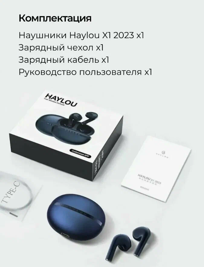 | Комплектация | 1. Беспроводные наушники Haylou X1 2023 2. Зарядный кейс 3. Кабель USB Type-C 4. Руководство пользователя |