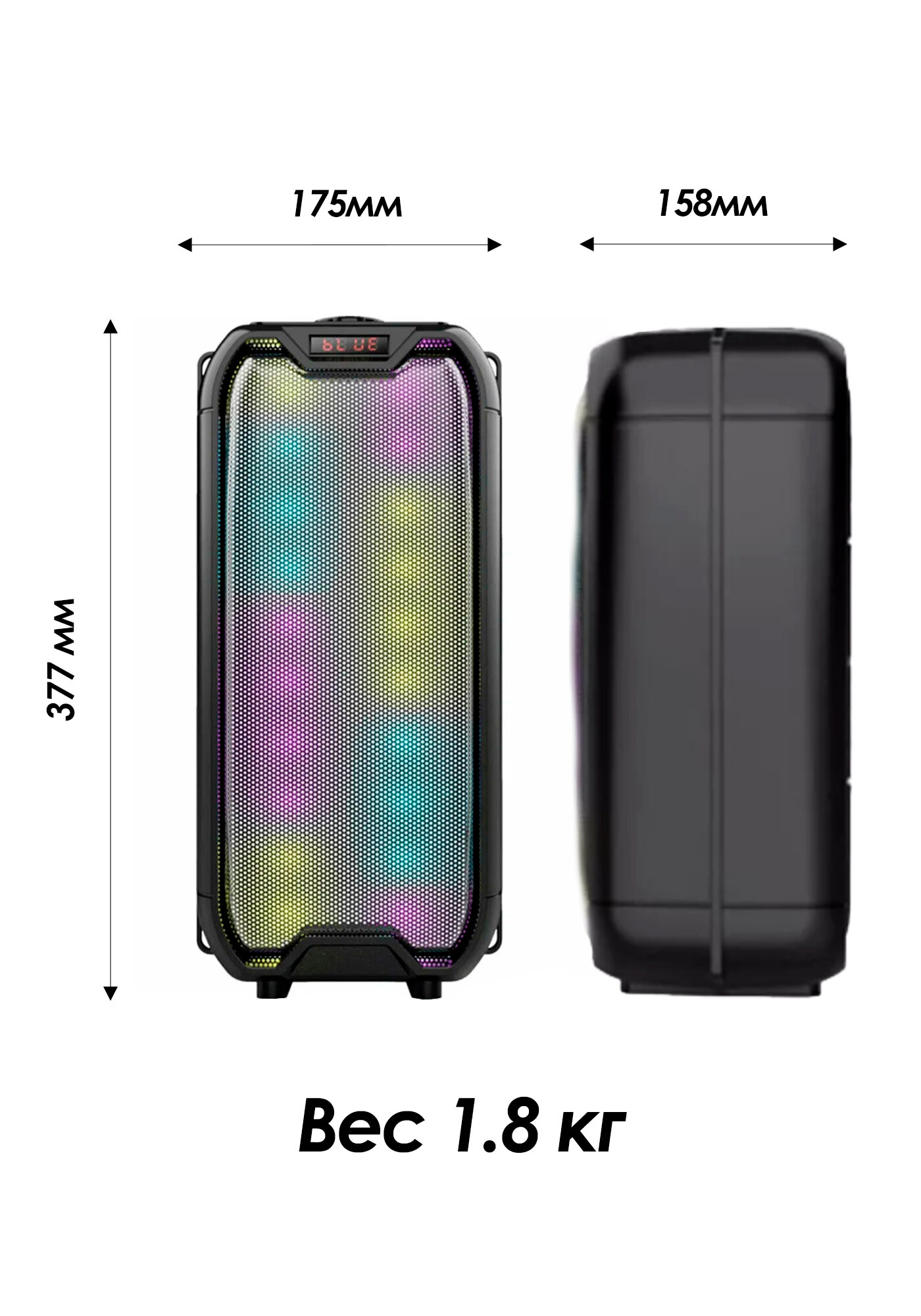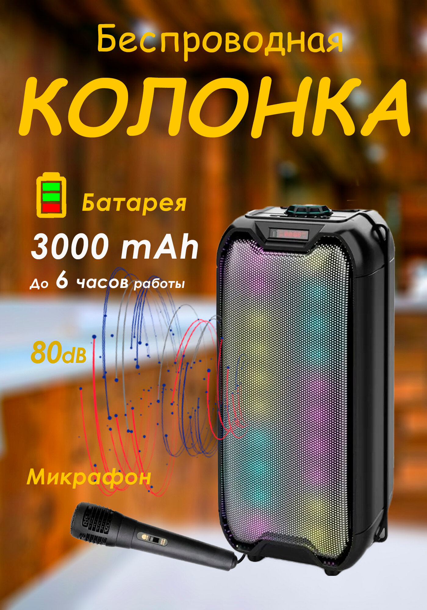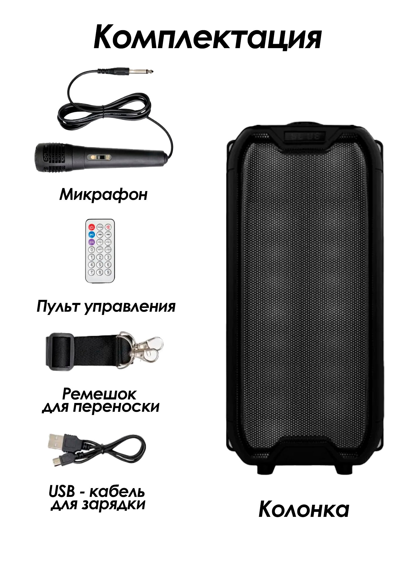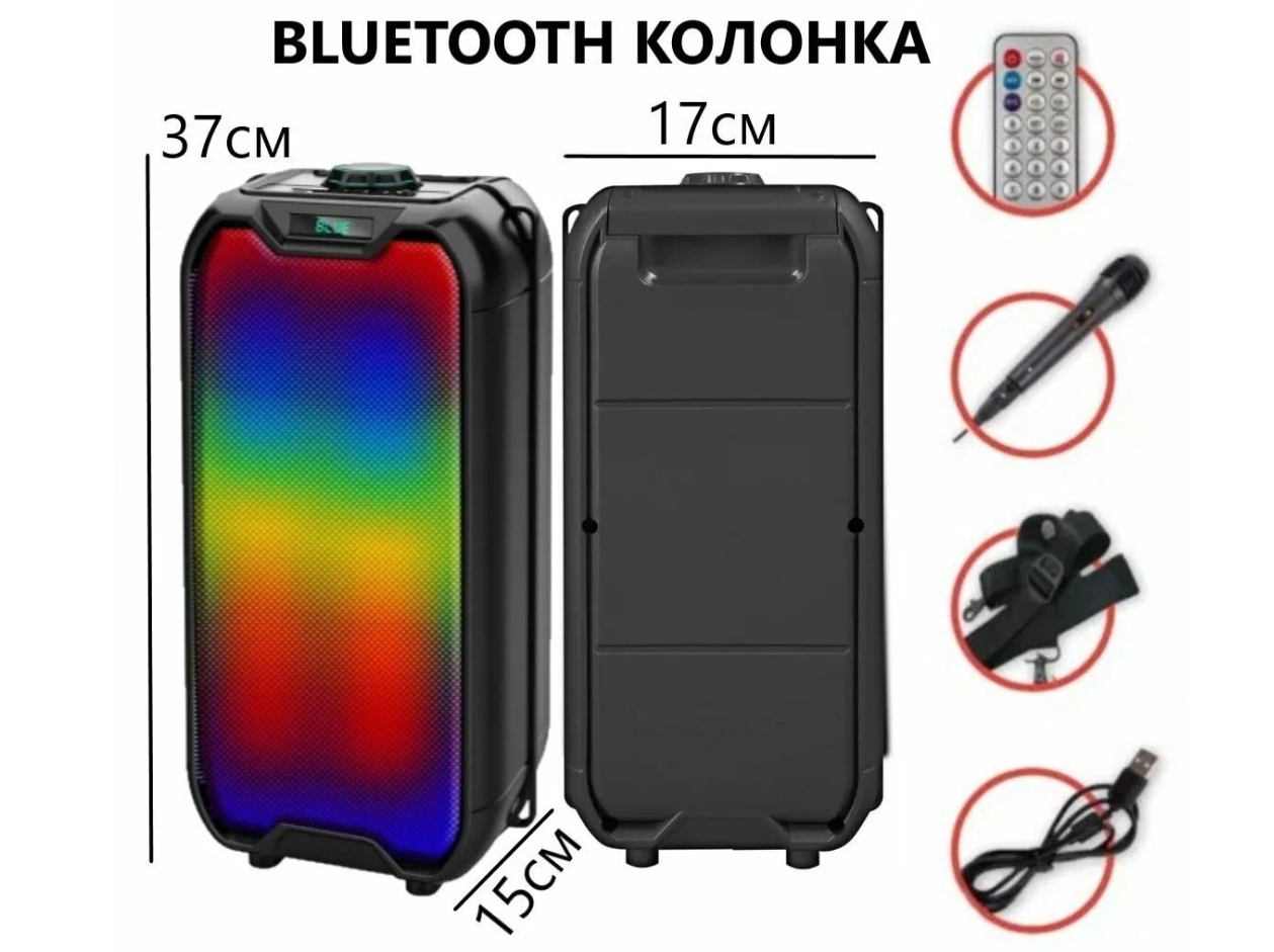 | Особенности | FM-радио / дисплей / караоке / поддержка microSD / режим Power Bank / ремешок / ручка / световые эффекты |