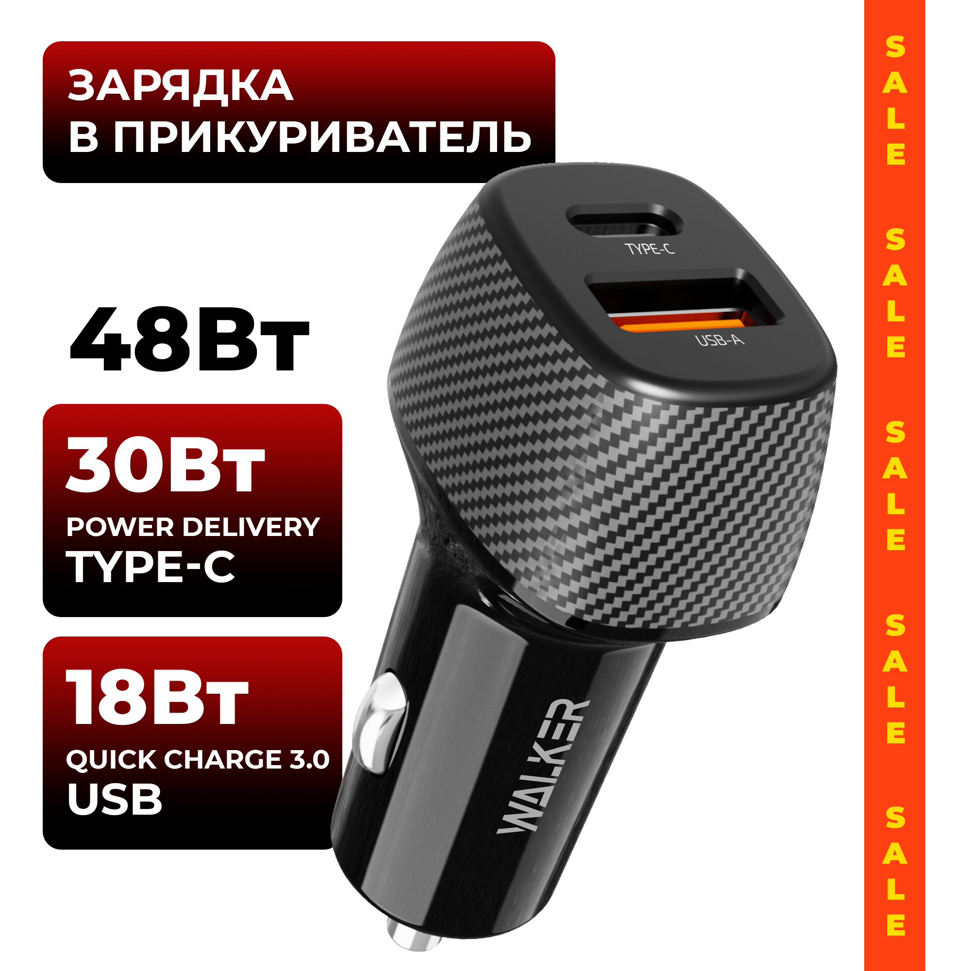 Зарядка в прикуриватель, WALKER, WCR-35, 48Вт, USB/Type-C, быстрая зарядка QC3.0/PD, блок питания type c, адаптер питания, зарядка для телефона, черный