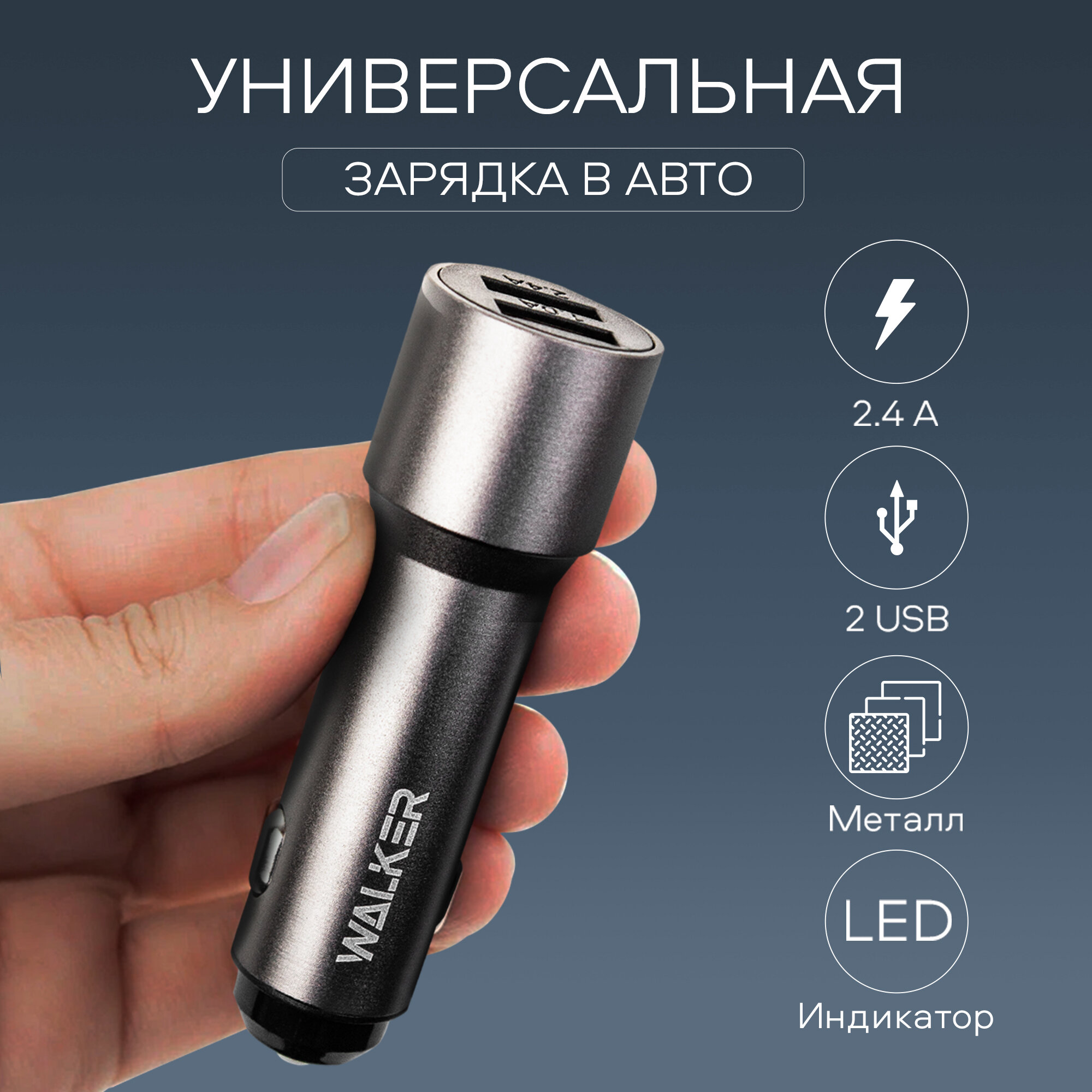 Зарядка в прикуриватель, WALKER, WCR-22, 12Вт, удлиненный корпус, 2 USB, 2.4А, зарядка в машину, зарядка для айфона, адаптер питания, серый