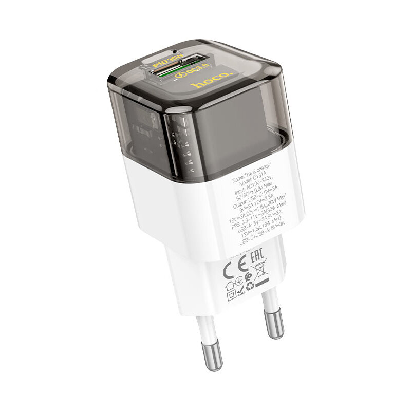 Сетевое зарядное устройство, 1 USB 3.0 QC+1 PD 30W (C131A), HOCO, прозрачный с черным