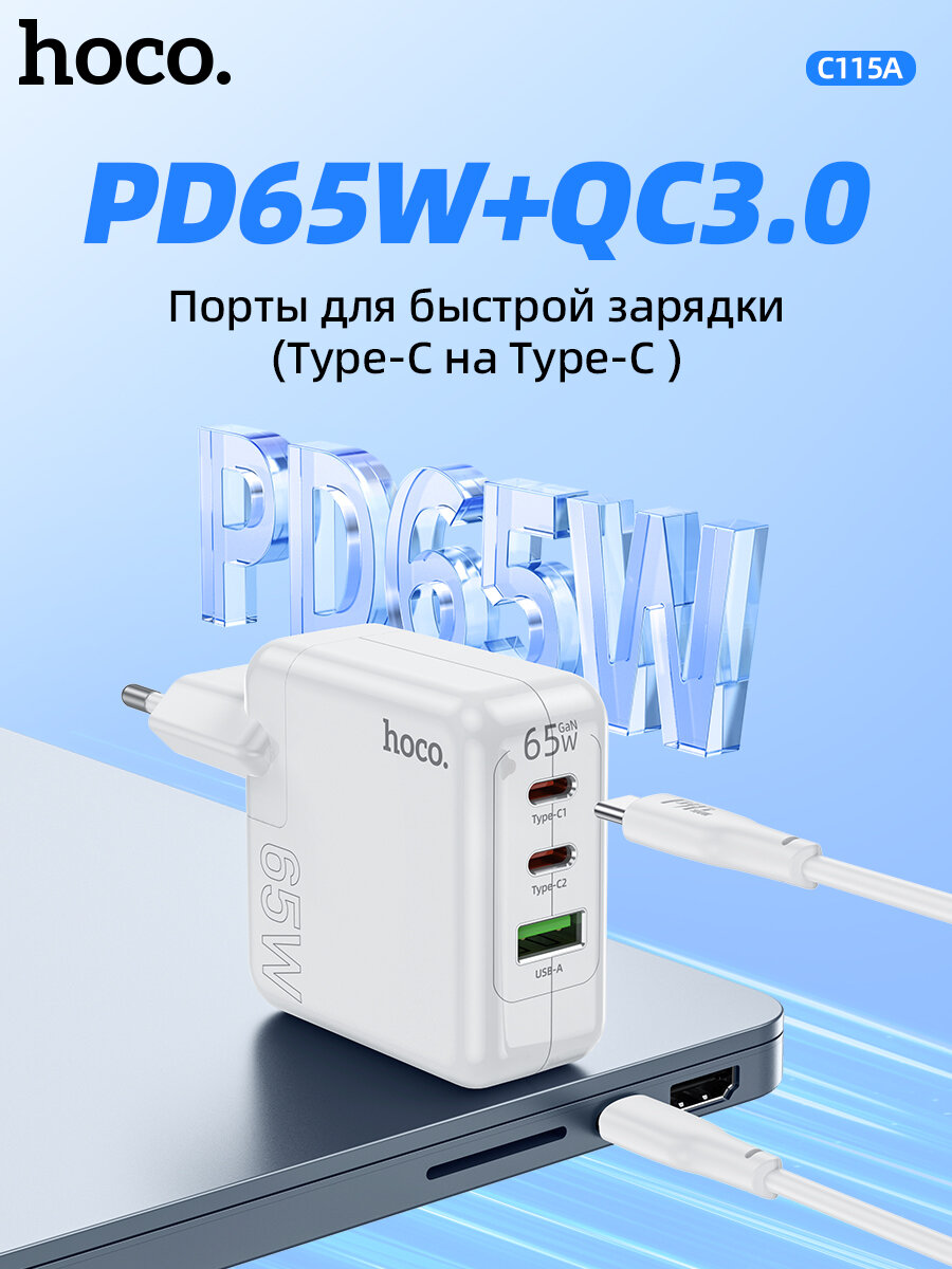 СЗУ HOCO C115A 1xUSB, 2xUSB-C, 3А, PD65W, QC3.0, GaN (белый)