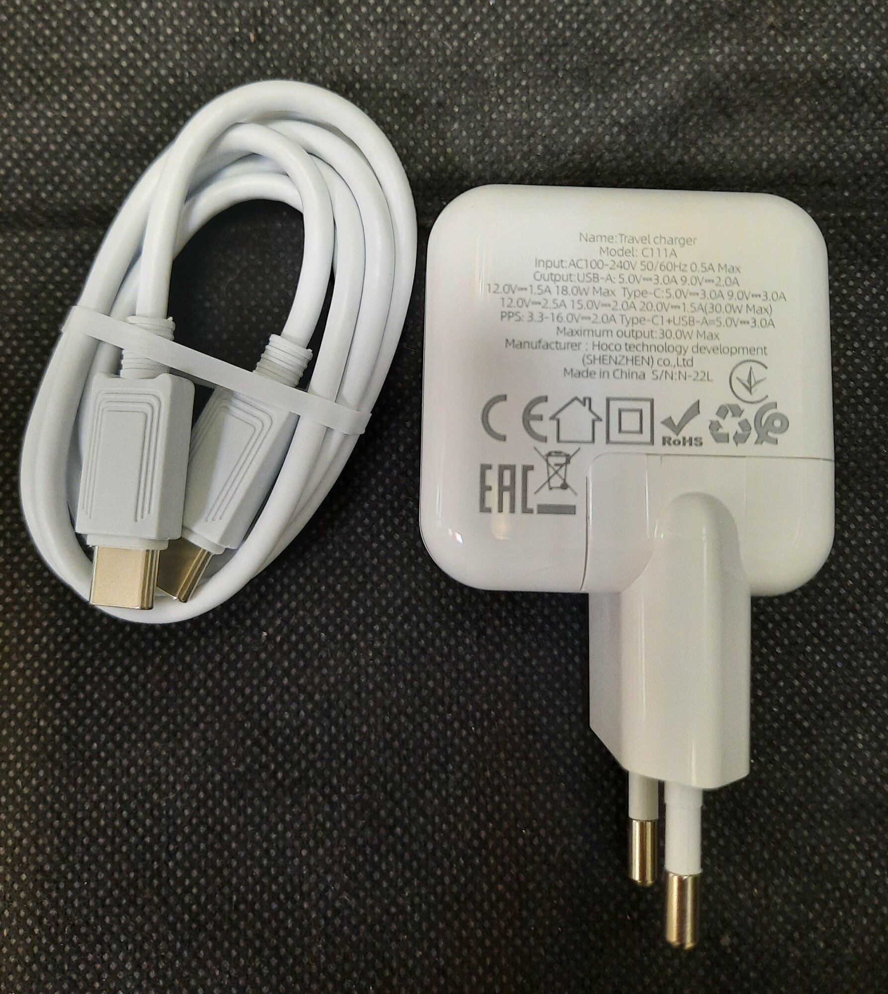 Сетевое зарядное устройство HOCO C111A 1xUSB + 1xUSB Type-C с кабелем Type-C - Type-C, 3.0A, 30W, белый