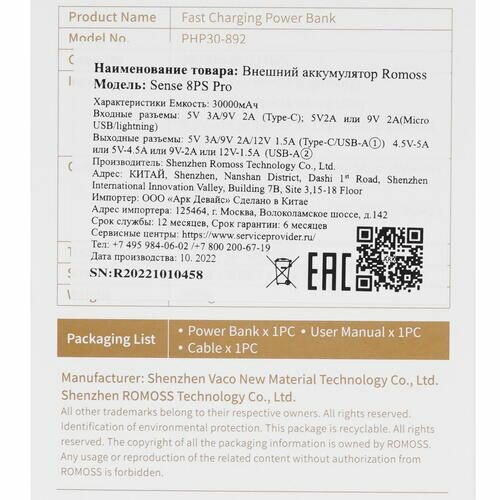 Портативный аккумулятор Romoss Sense8PS Pro 30000mAh Lightning USB-C microUSB белый