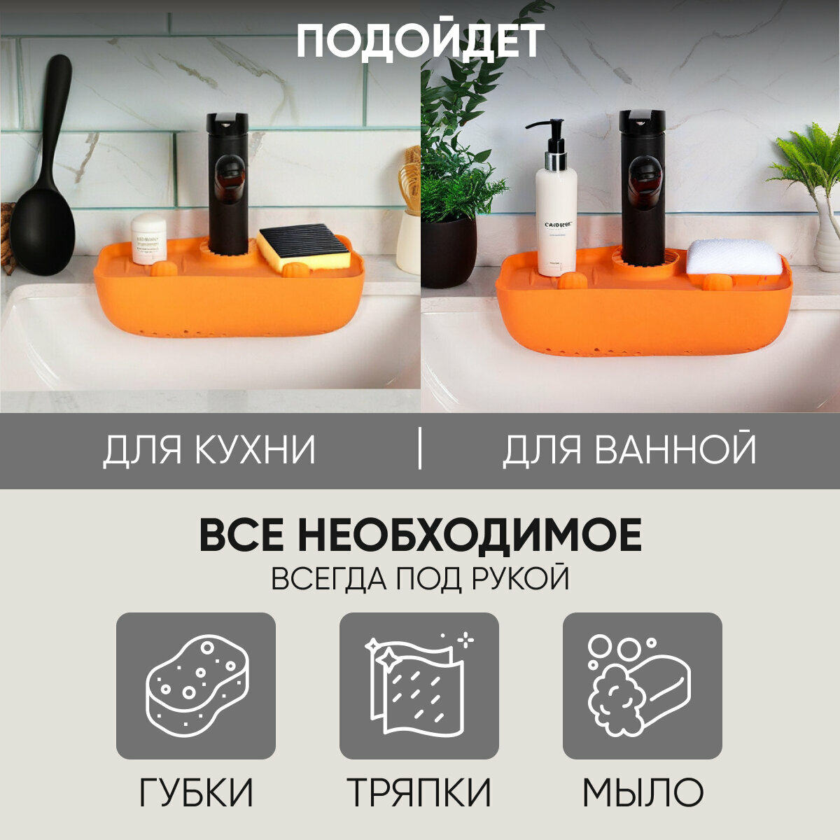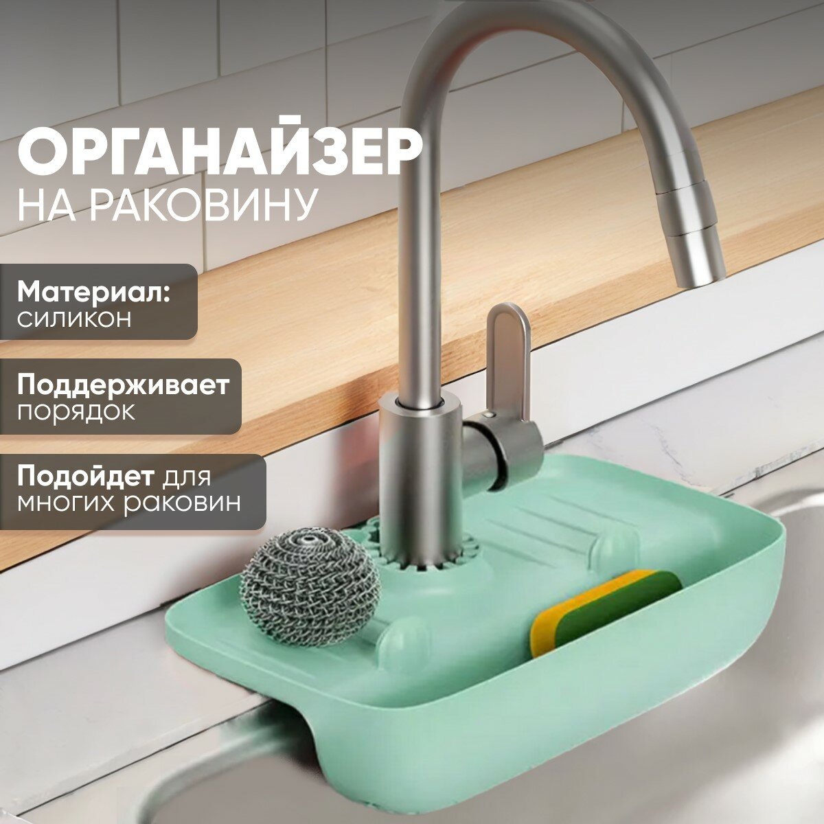 Держатель кухонный для губки и мыла на раковину, коврик-органайзер на кухонный кран для губки и моющих средств силиконовый универсальный интересное:
