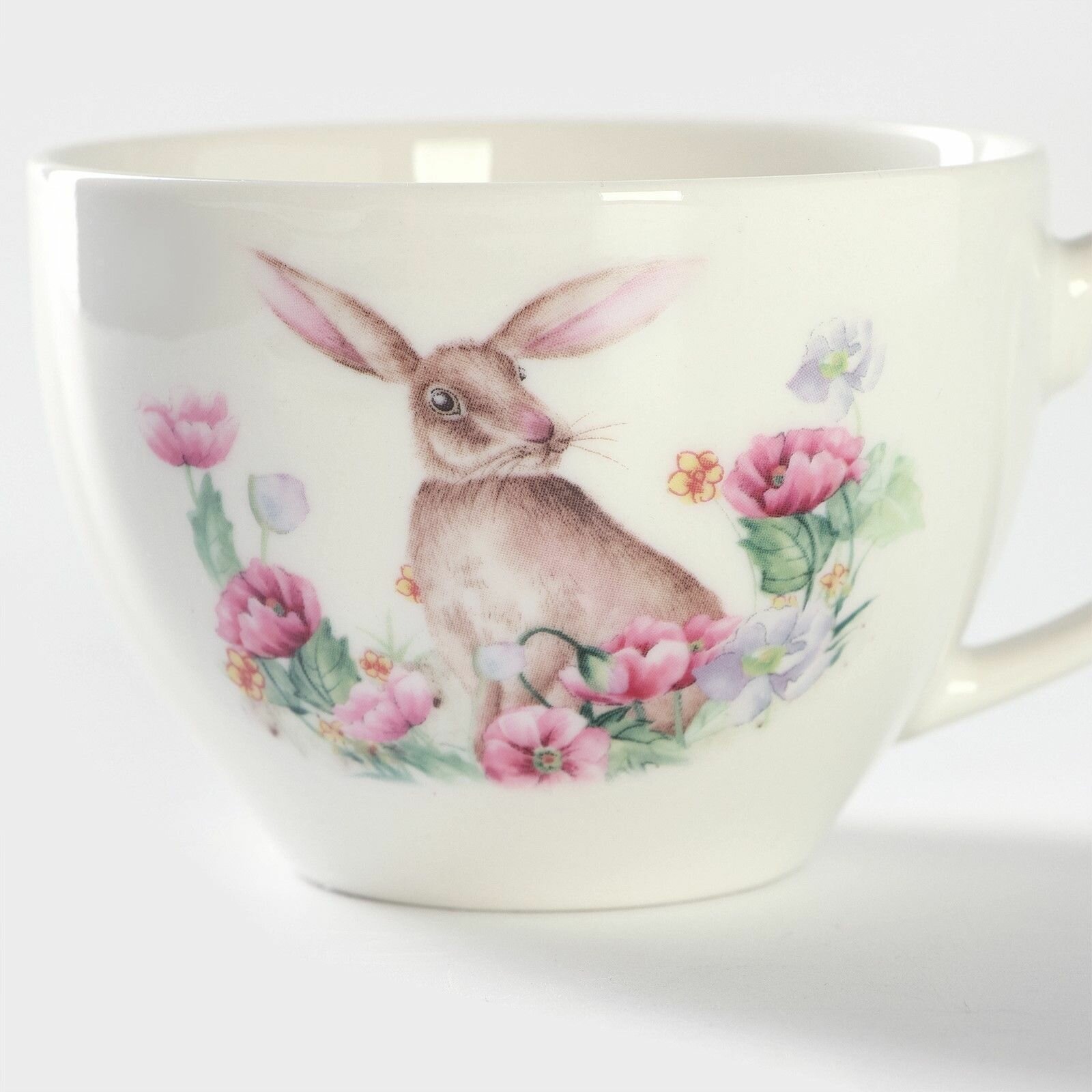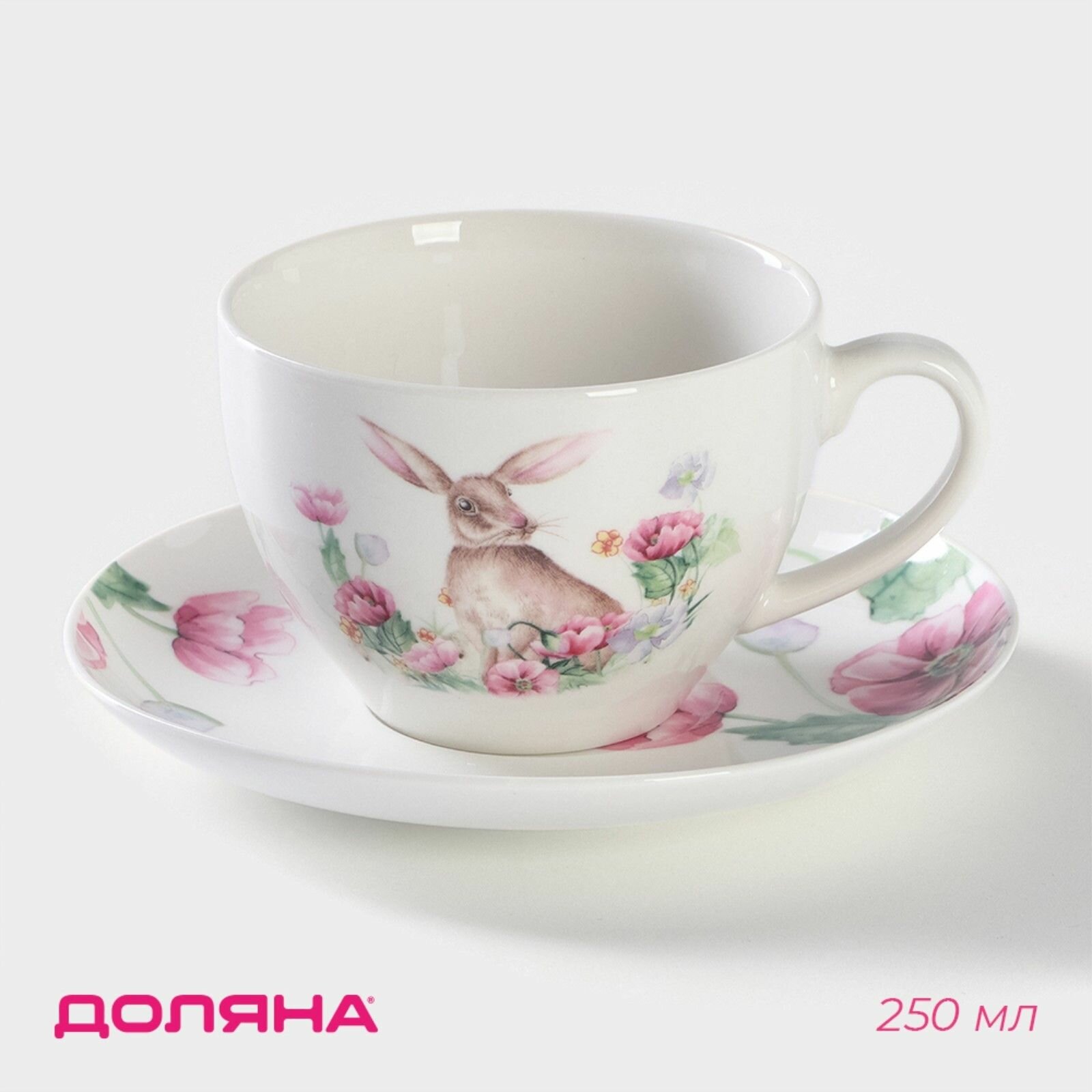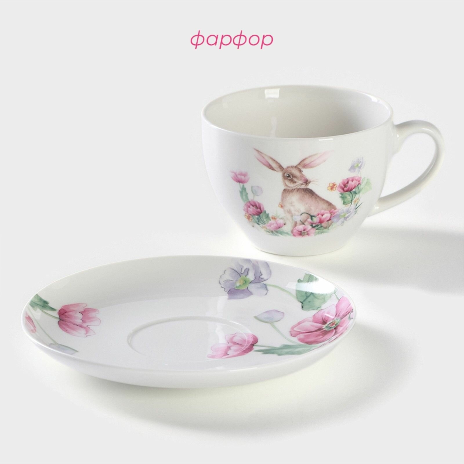 Купить Чайная пара фарфоровая Доляна «Зайка», 2 предмета: чашка 250 мл, блюдце d=15 см, цвет белый