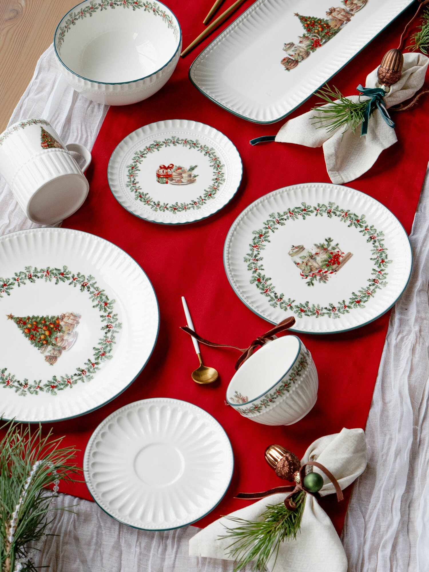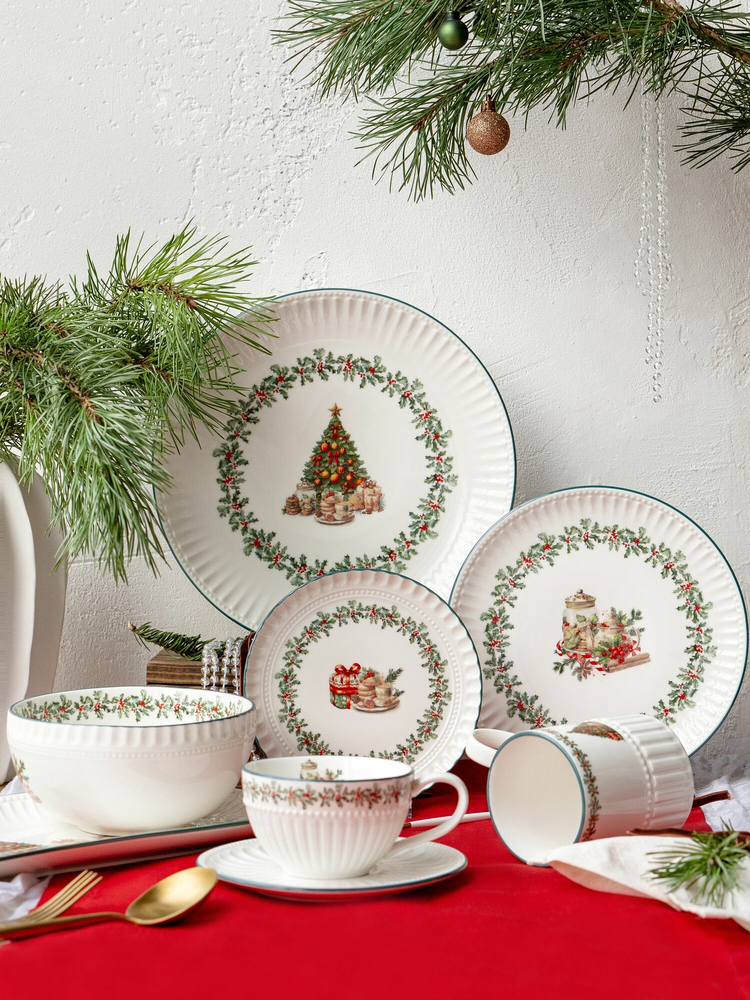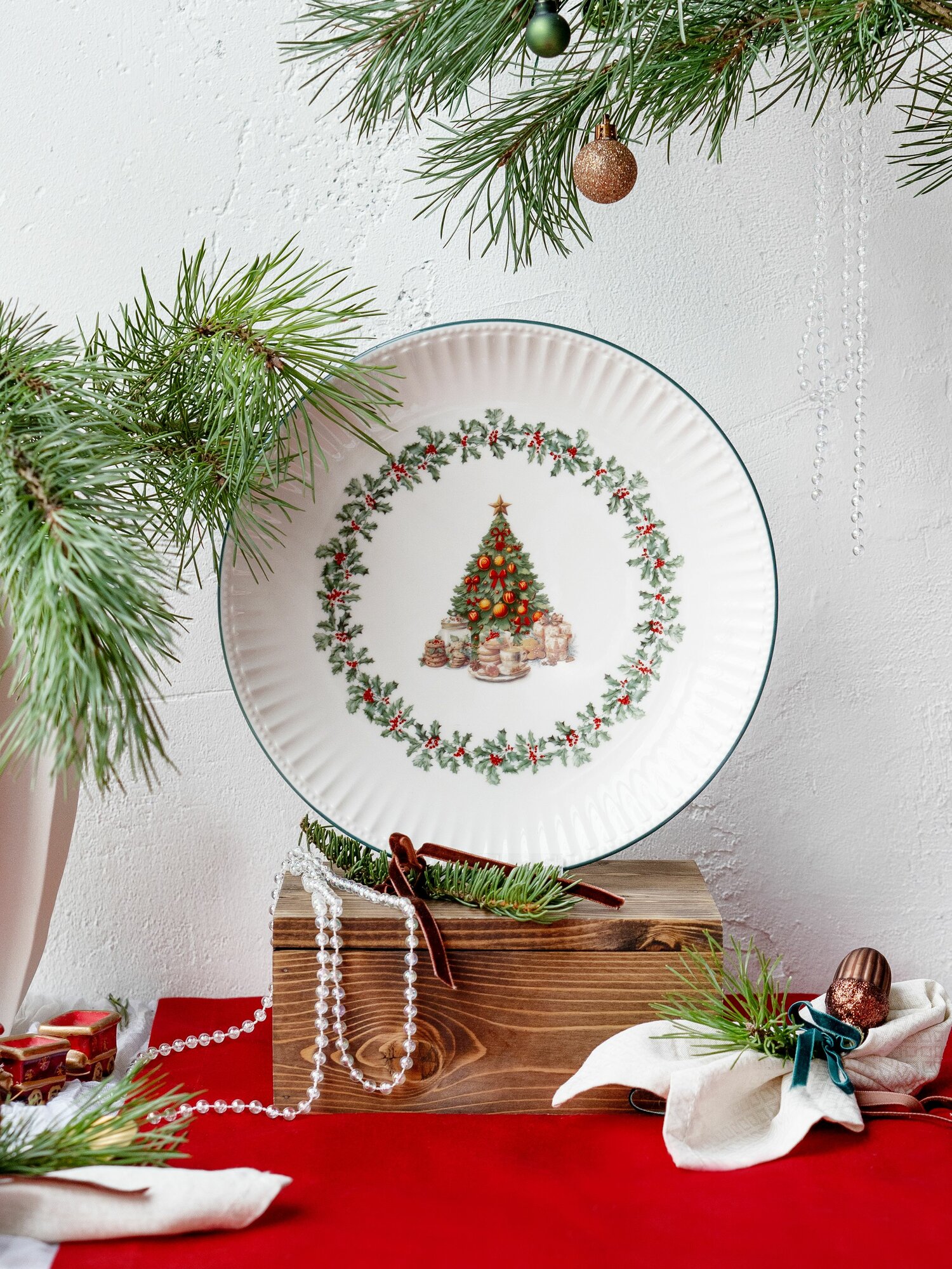 Тарелка фарфор 26 см. "Новогодний венок" блюдо для подачи и сервировки посуда новогодняя Коралл. интересное: