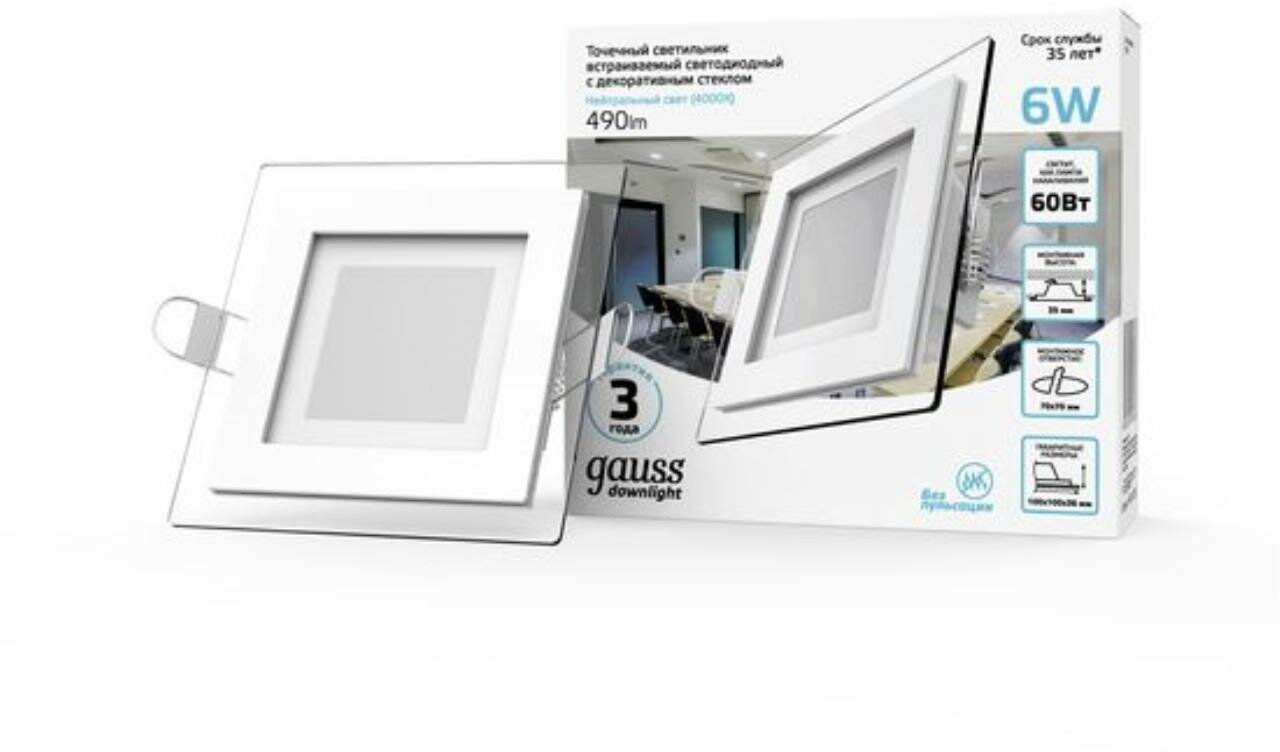 Купить Светильник потолочный встраиваемый 6W нейтральный белый свет 4000K 100*100*36мм 220V IP20 с декор стеклом Gauss Glass