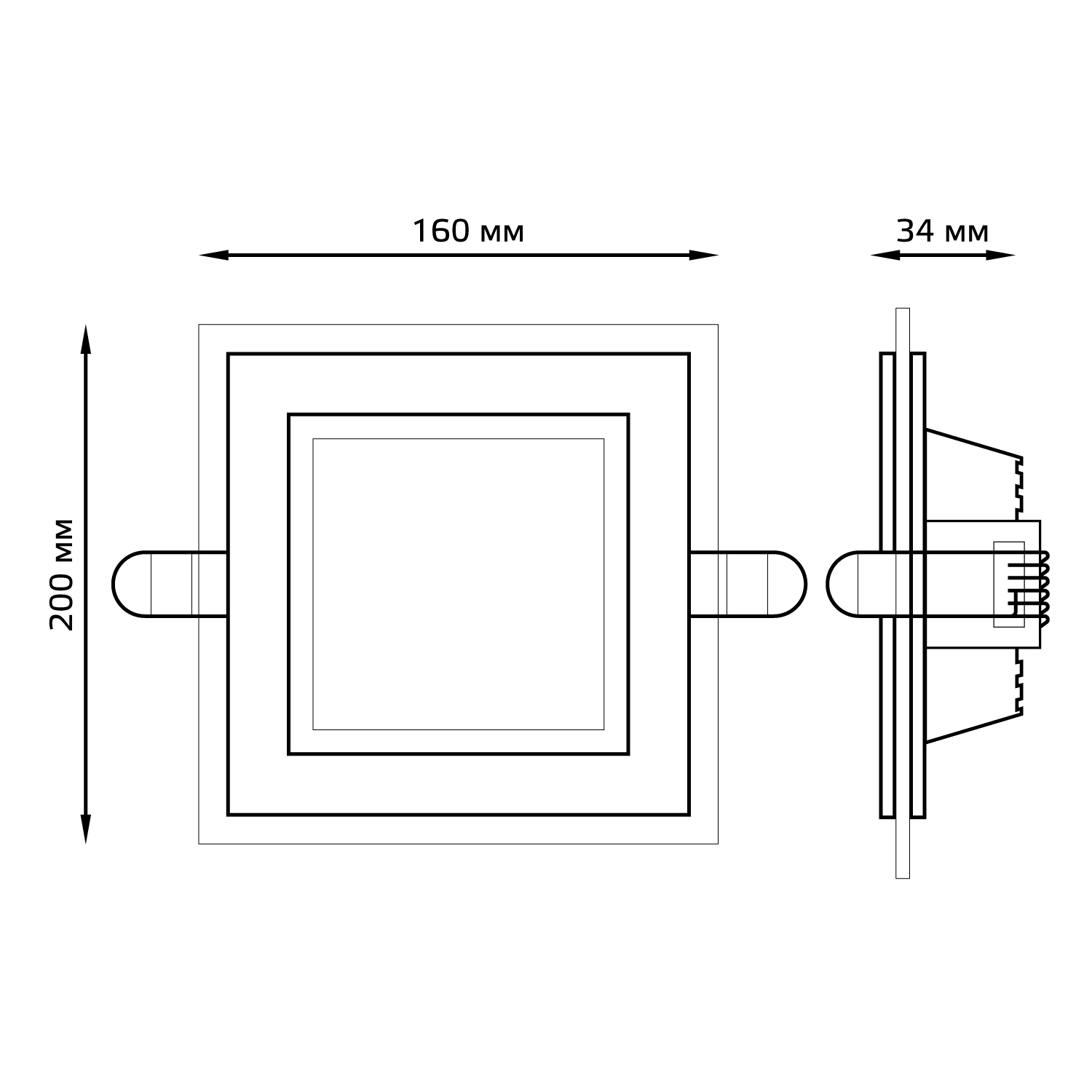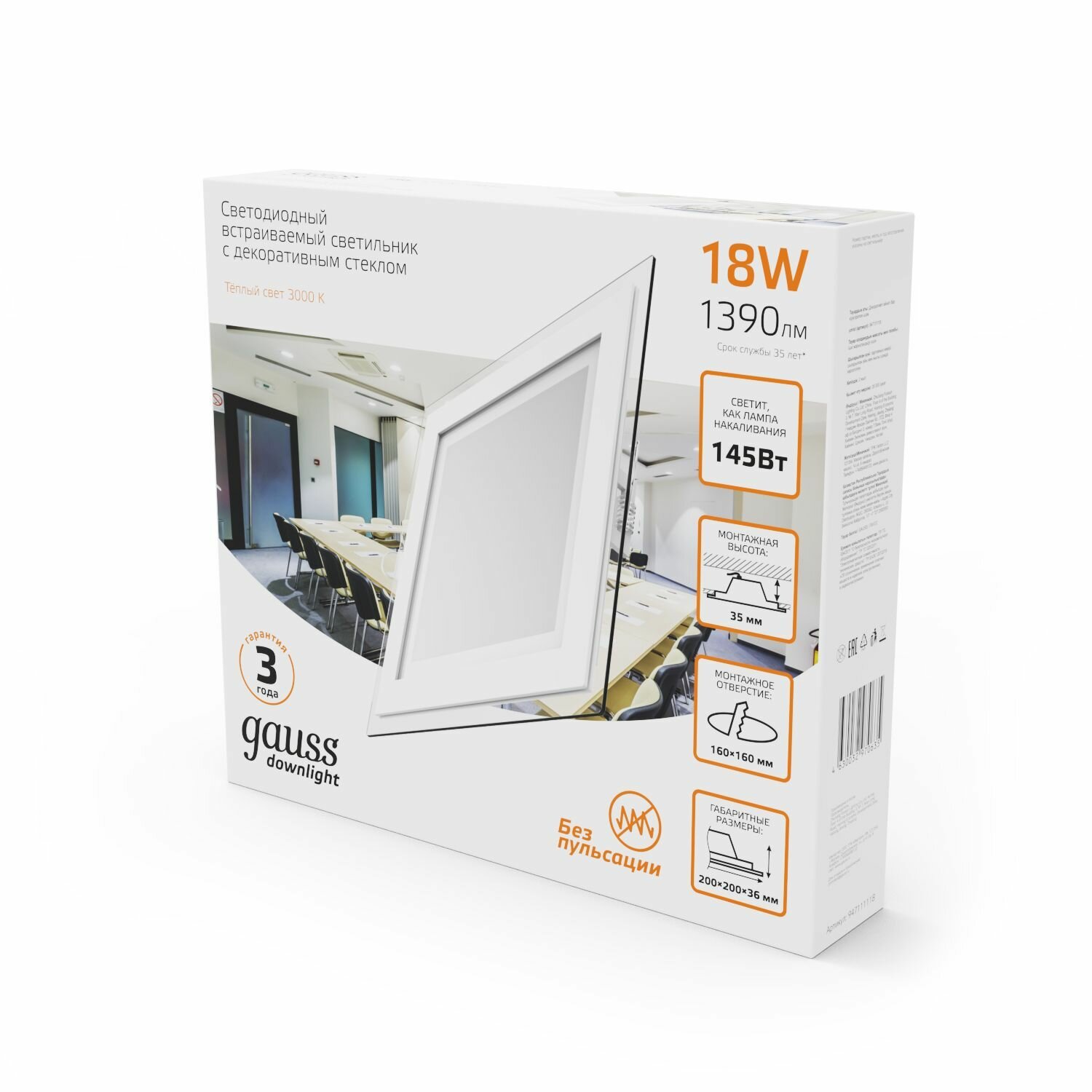 Встраиваемый светильник Gauss , квадратный с декоративным стеклом,200х200х30, 150х150, 18W 3000K, 1390лм 1/20