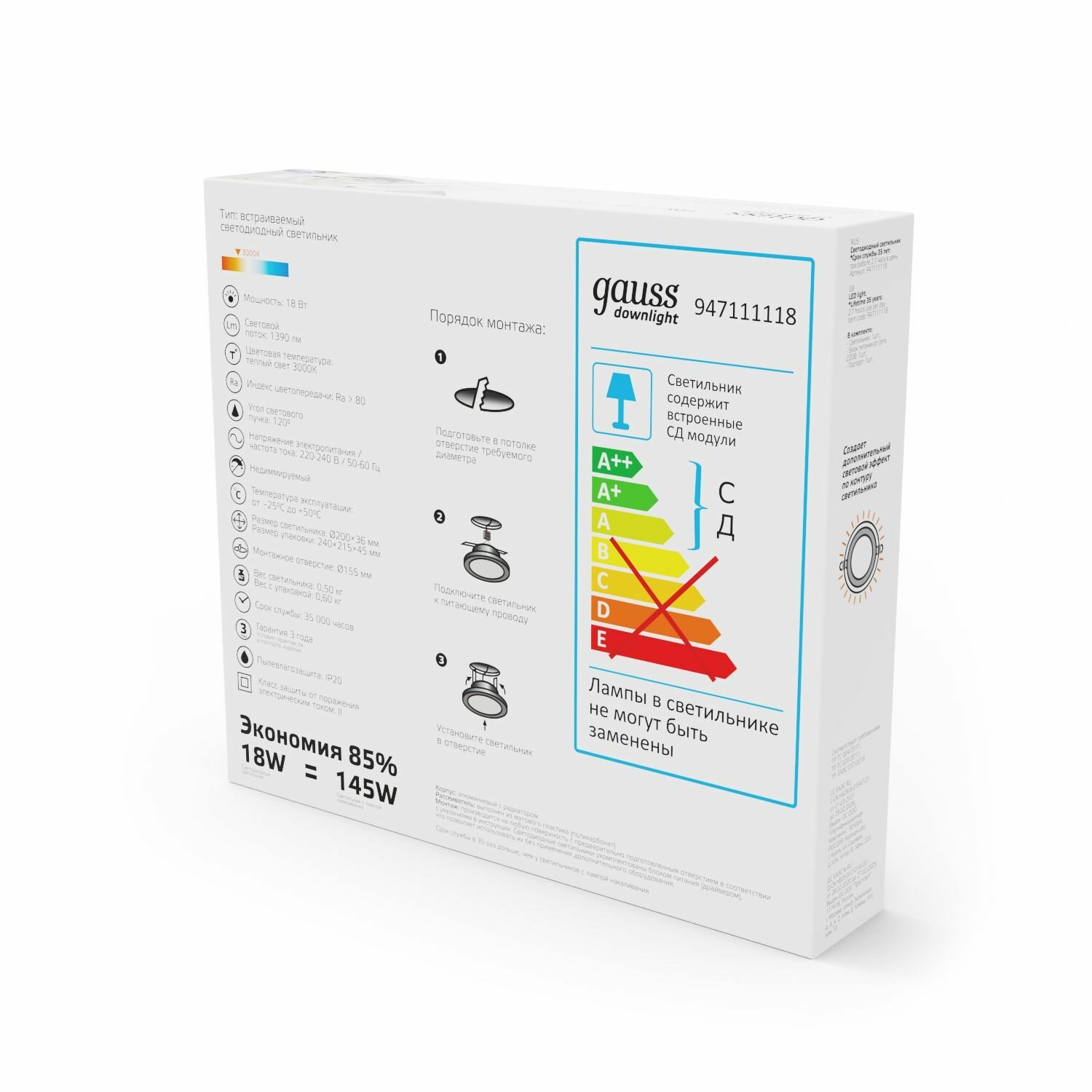 Светильник Gauss 948111118 18Вт 3000K цв.св.:белый теплый белый