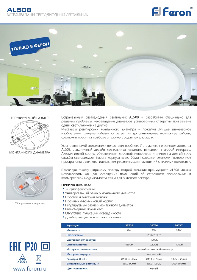 Feron св-к встр. св/д даунлайт под любое отверстие(50-100мм) 9W(720lm) 6400K 6K 118x20 AL508