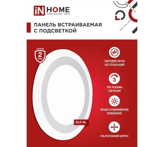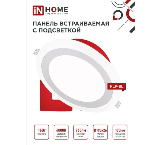 Купить IN HOME Панель сд встраиваемая круглая RLP-BL 16Вт 230В 4000К 960Лм 195мм с подсветкой белая IP20 (арт. 4690612032979)