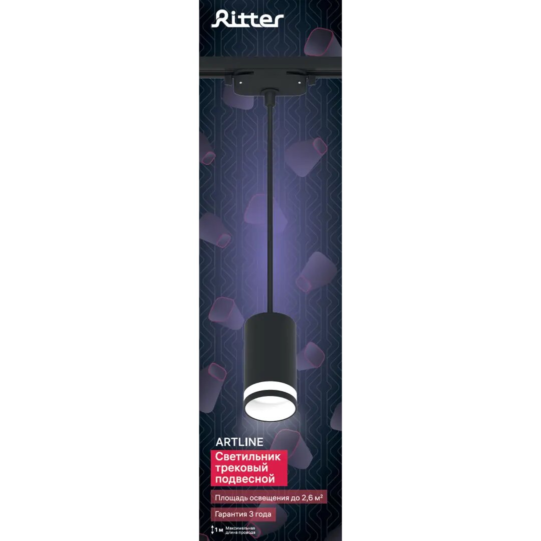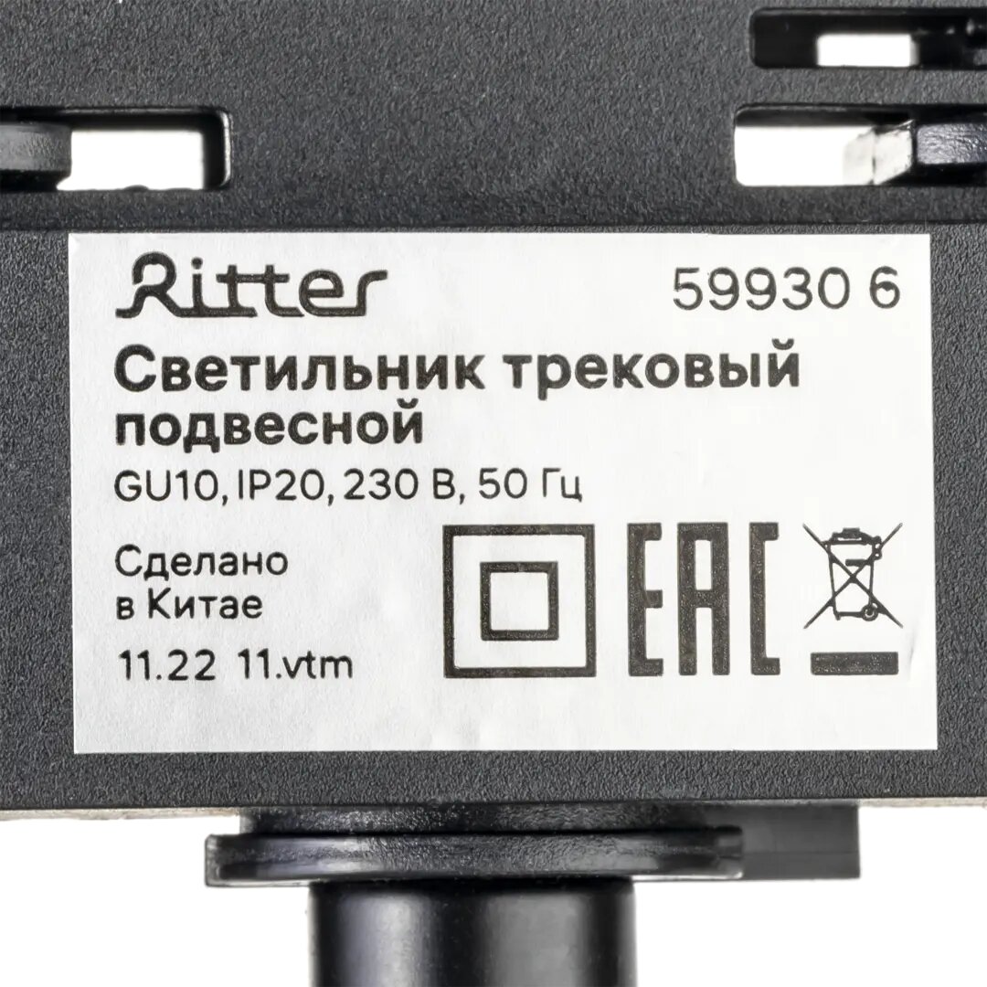 Трековый светильник подвесной однофазный под лампу GU10, алюминий/пластик, черный, до 40Вт, крепление на любой шинопровод 220В, Ritter ARTLINE 59930 6