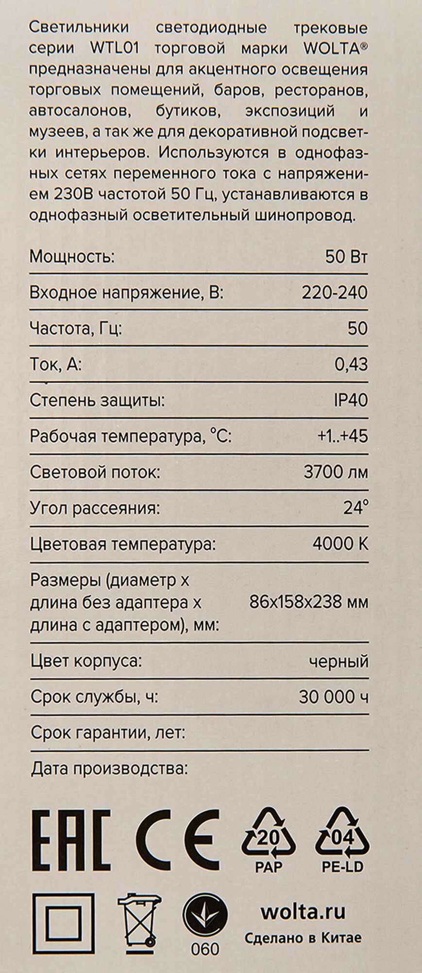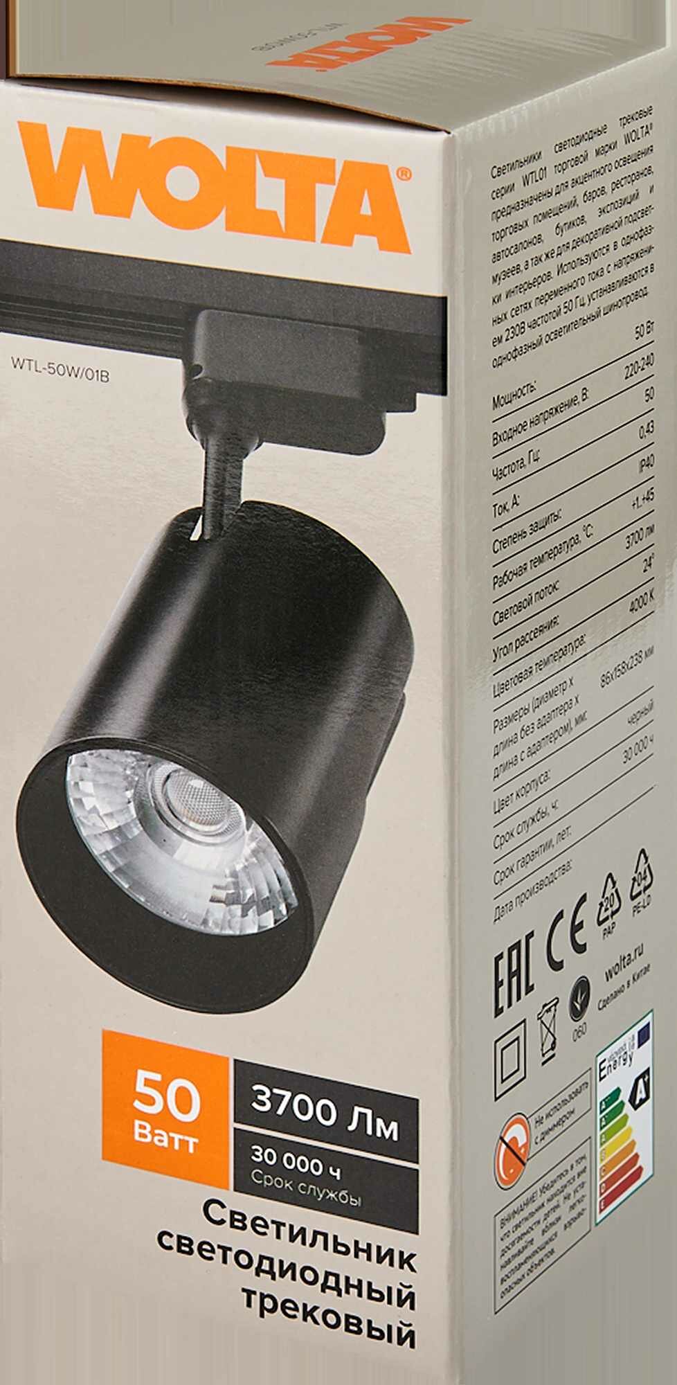 Светильник светодиодный трековый WOLTA WTL-50W/01B 50Вт 4000К 3600лм черный интересное: