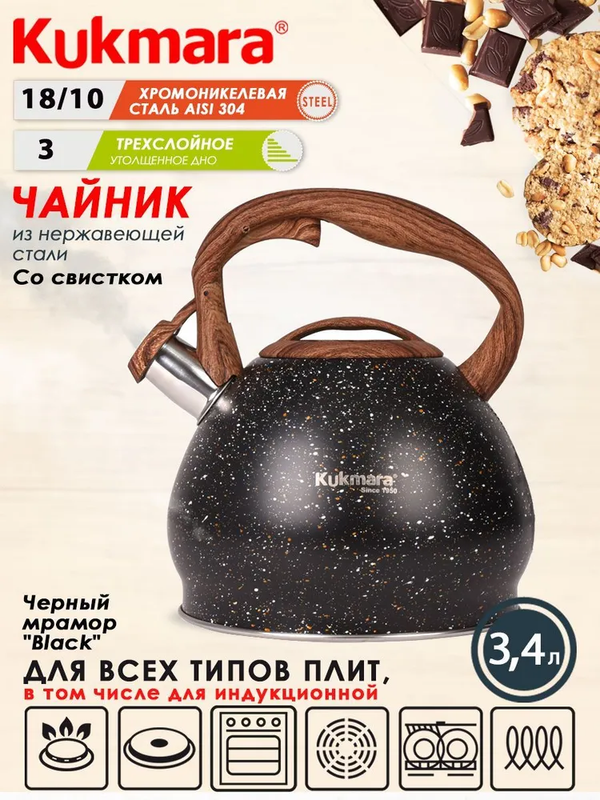 Чайник со свистком из нержавеющей стали 3,4л черный мрамор "Black" kuk-07/3103555 (12/1) .