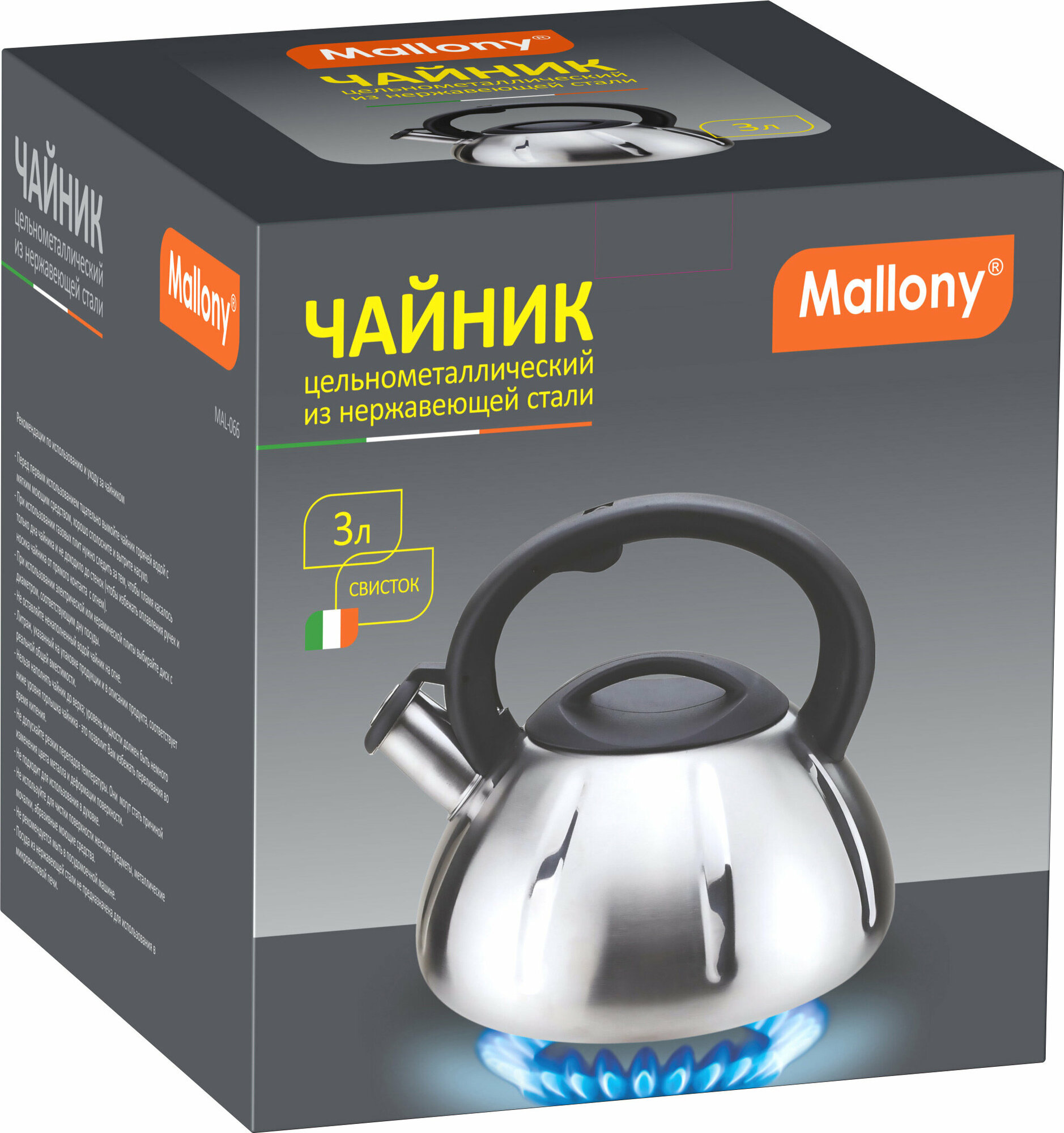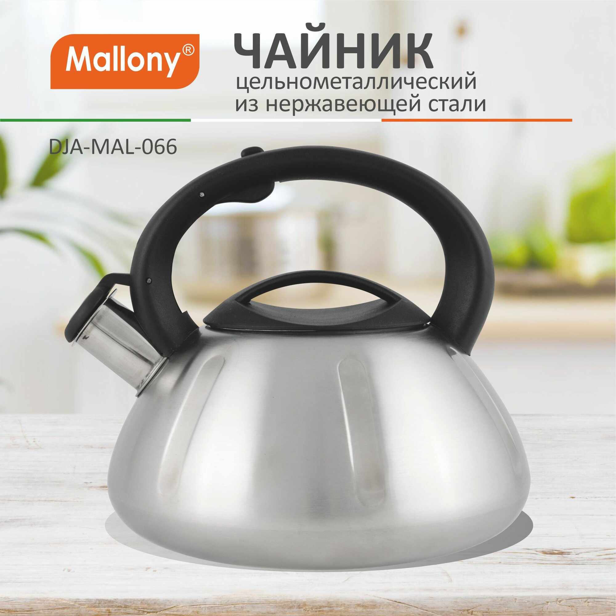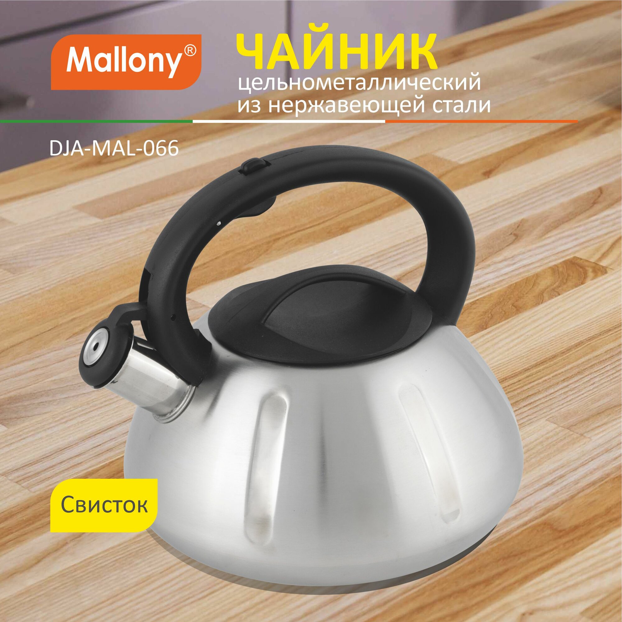 Чайник со свистком Mallony MAL-066, 3.0л, нержавеющая сталь матовый (цельнометаллический, ручка пластик) (910086)