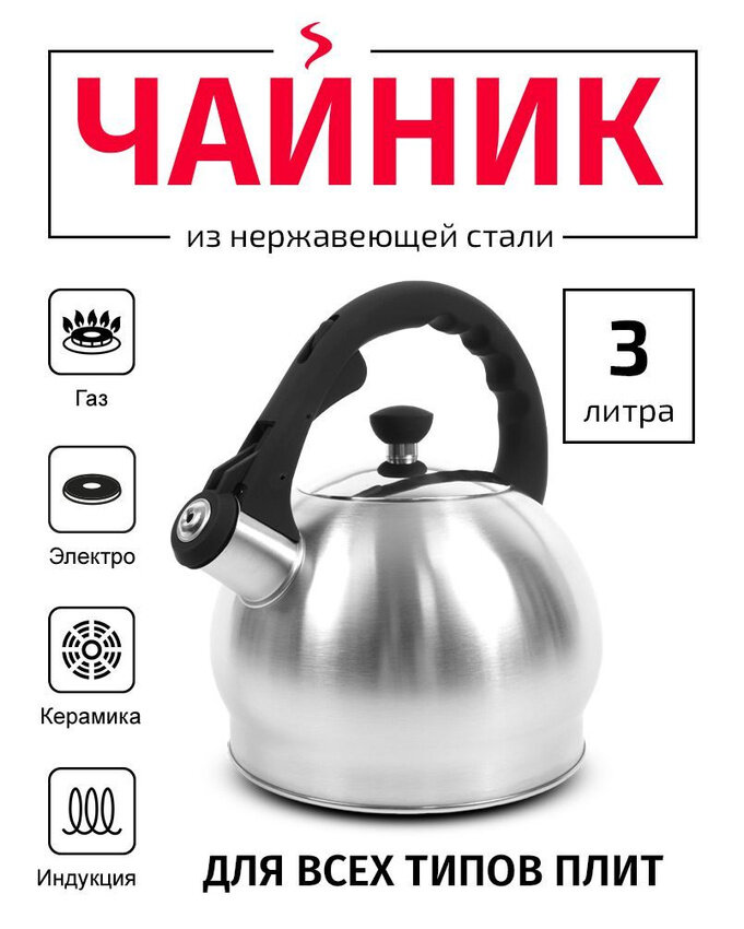 Чайник матовый TimA со свистком, нержавеющая сталь, объём 3л., Soft-touch ручка, капсульное дно интересное: