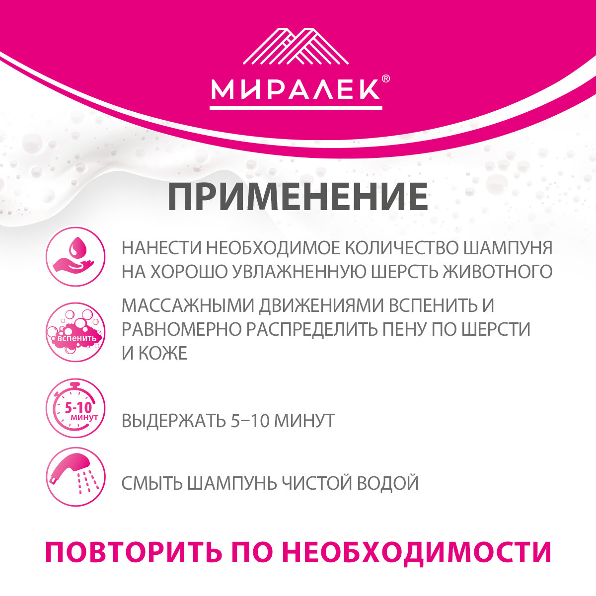 | Способ применения | «Шампунь Скинвет» наносят в небольшом количестве на предварительно хорошо увлажненную шерсть животного. Шампунь вспенить массажными движениями и равномерно распределить пену по шерсти и коже животного, выдержать около 5–10 минут и смыть чистой водой. При необходимости процедуру повторить. После проведения процедуры шерсть животного высушить и расчесать. Особо эффективен при применении с «Муссом Скинвет». |