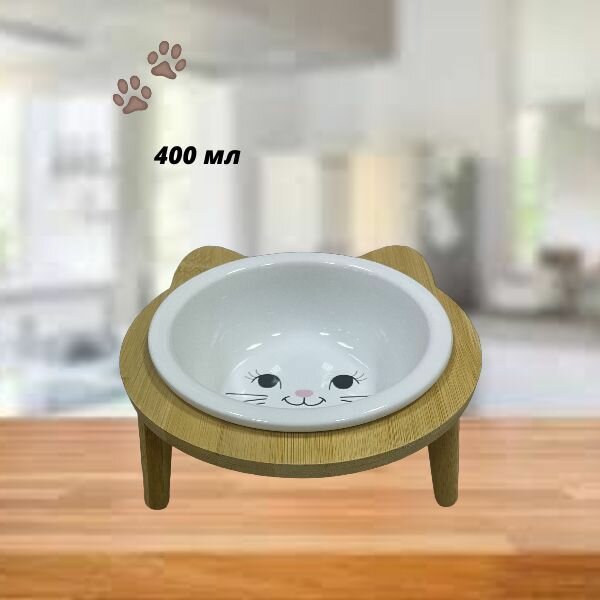 Купить Миска для кошек Mr.Kranch Bamboo керамическая белая на бамбуковой подставке 400 мл