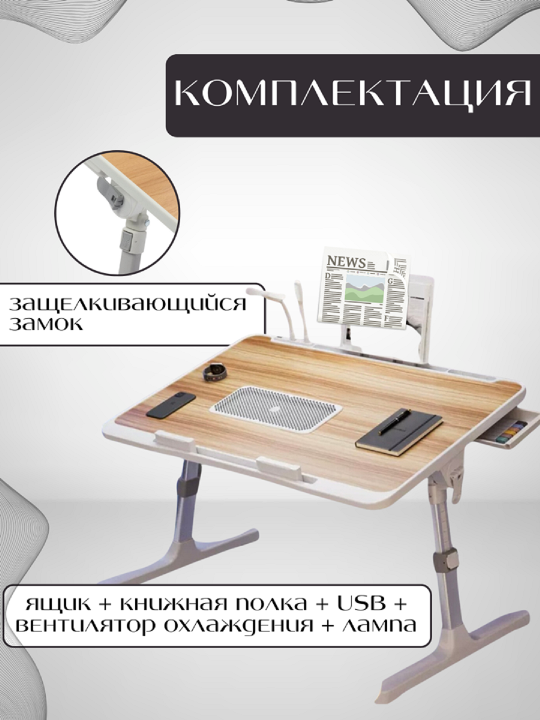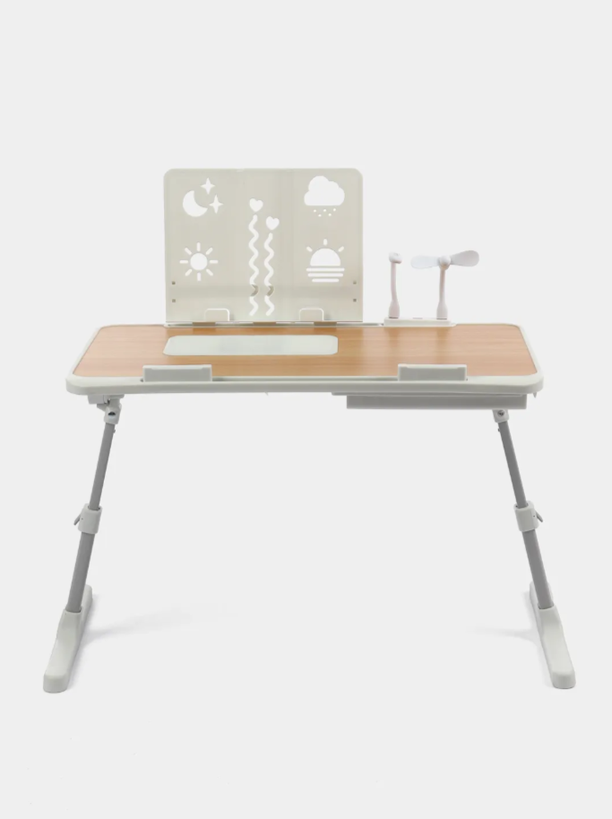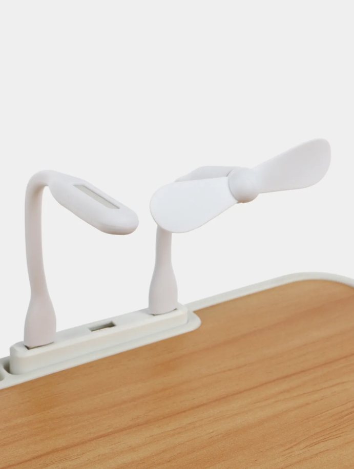| Подробная комплектация | Стол со встроенным вентилятором - 1 шт. Стопер для ноутбука - 2 шт. USB разветвитель на 3 порта и кабель к нему - 1 шт. Вентилятор - 1 шт. Лампа - 1 шт. Подставка для книг - 1 шт. Выдвижной ящик - 1 шт. |