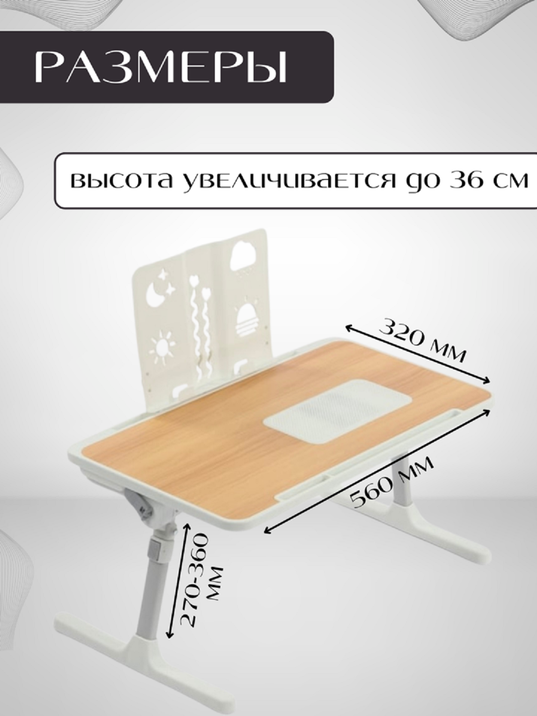 | Особенности | антискользящая поверхность, подсветка, регулировка высоты, регулируемый угол наклона, с охлаждением, с упором, трансформер |