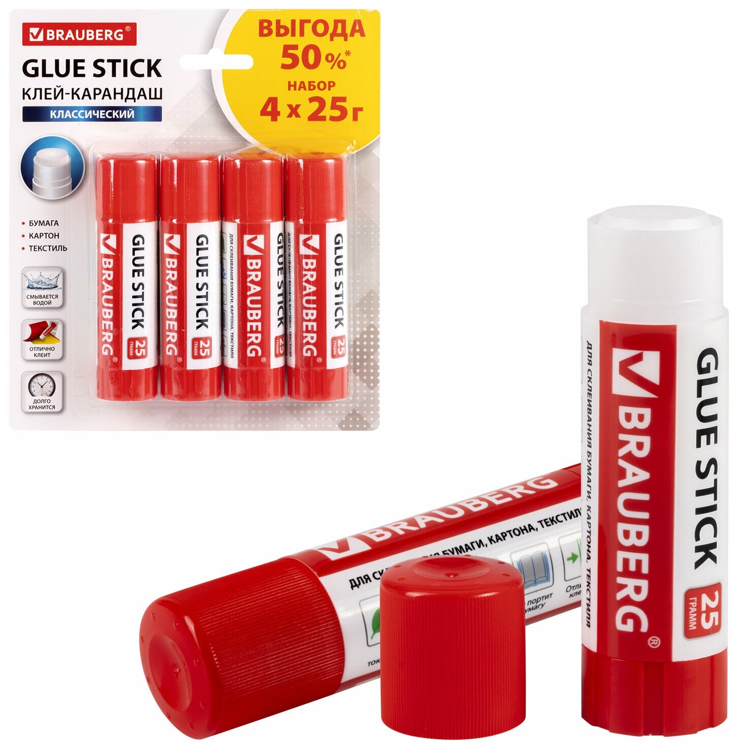 Клей-карандаш канцелярский для бумаги и картона Brauberg, комплект/набор из 4 штук по 25 г в блистере