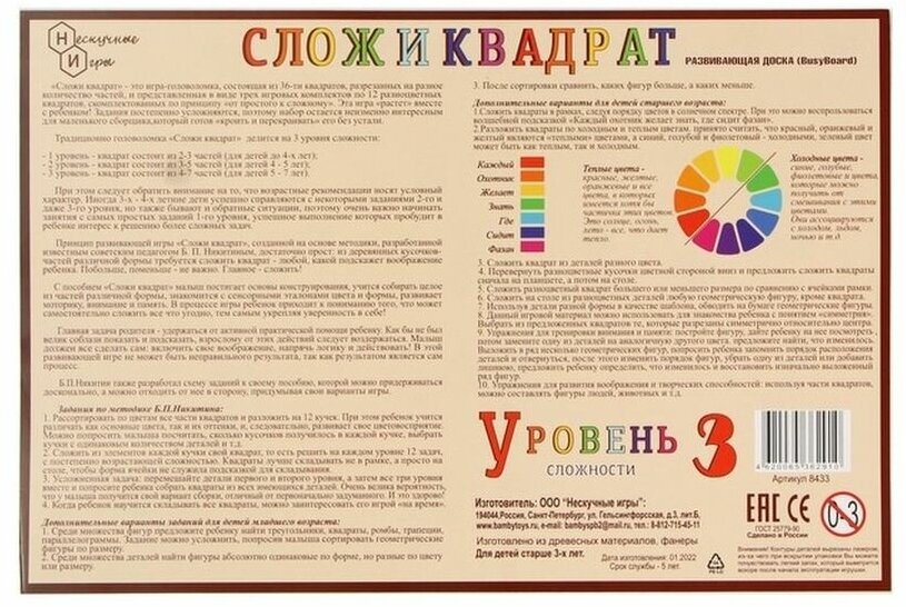 Развивающая доска Сложи квадрат 3 уровень сложности арт.8433 /32 интересное: