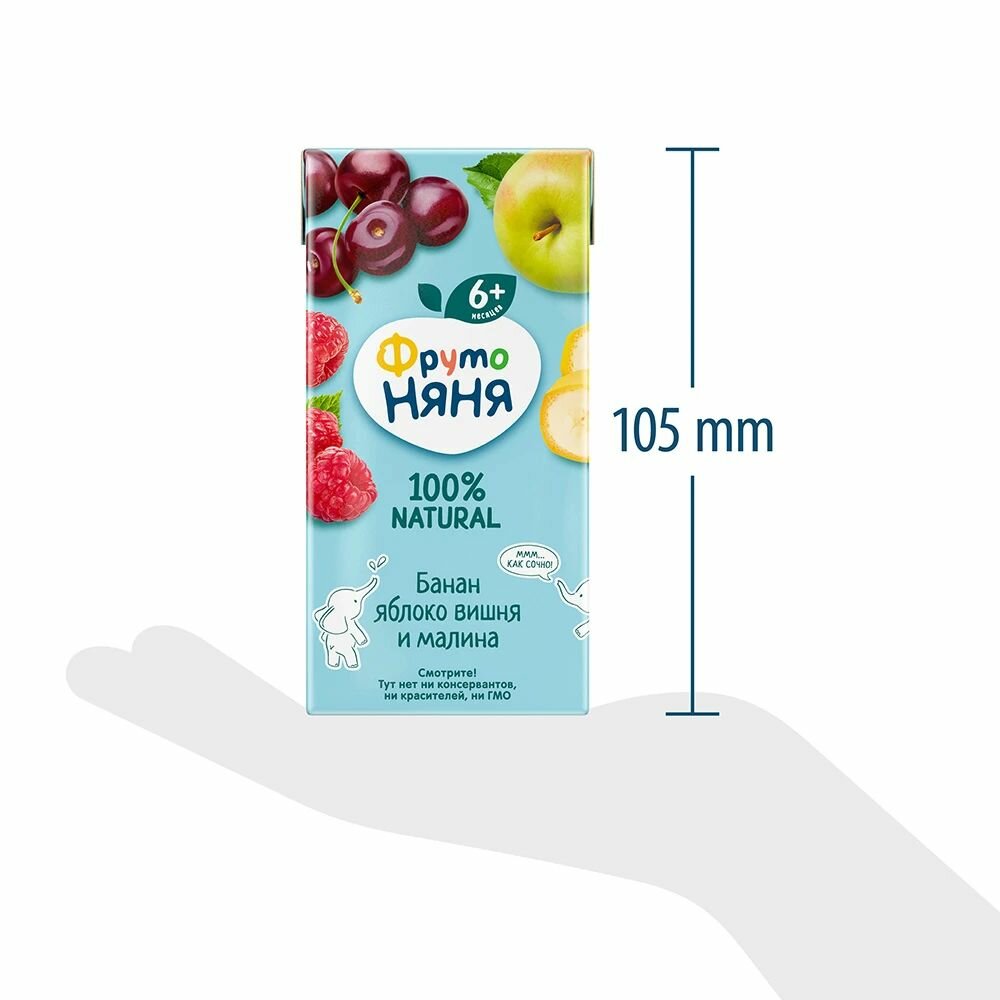 | Состав | Фрукты: банановое пюре. Пищевые добавки: сахар, лимонная кислота, вода. Концентраты: концентрированный яблочный сок, концентрированный вишневый сок, концентрат малинового сока. Объемная доля сока (пюре), не менее 38%. |