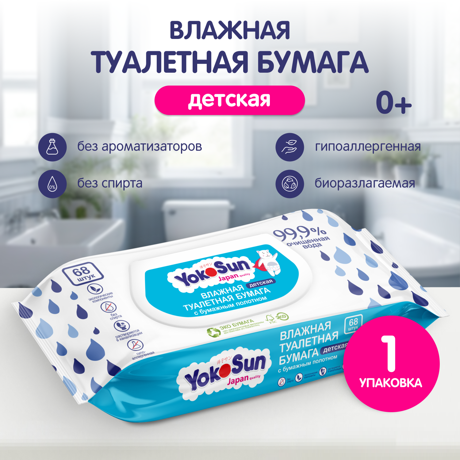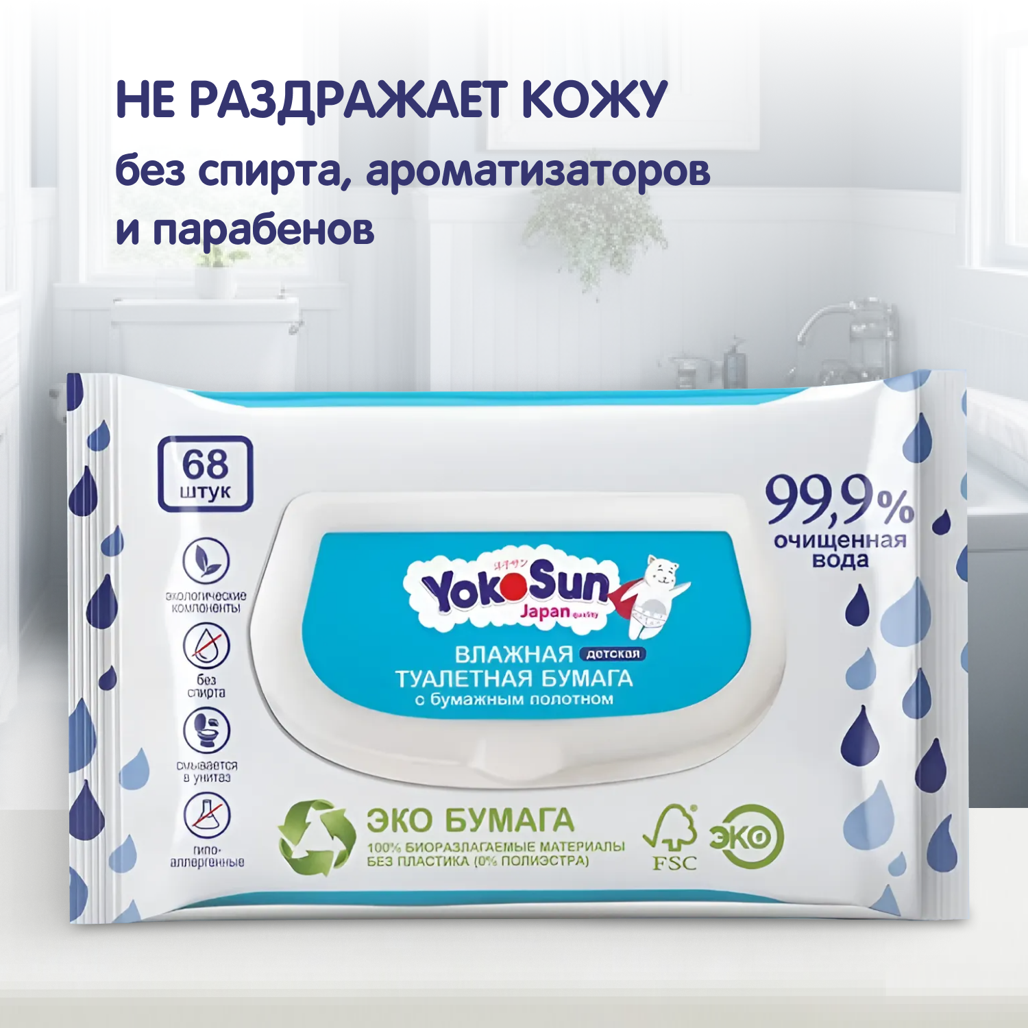 Влажная туалетная бумага детская с бумажным полотном YokoSun, пластиковая крышка, 68 шт., 1 уп.