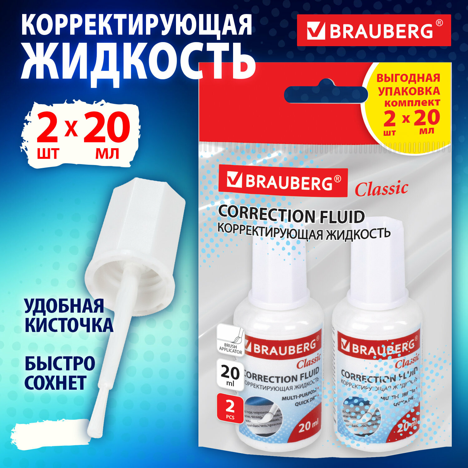 Корректирующая жидкость Brauberg 20 мл, выгодная упаковка, комплект 2 штуки в пакете, "Classic", 271919