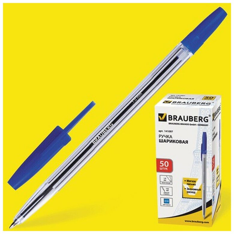 Купить Ручка шариковая Brauberg Line, корпус прозрачный, узел 1 мм, линия письма 0,5 мм, синяя (141097)