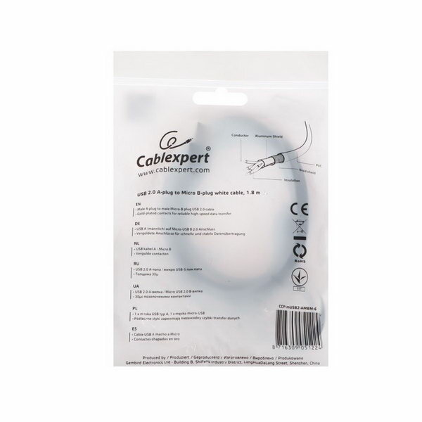 Кабель USB 2.0 A - micro USB 5pin (m-m), 1,8м, Pro CC-mUSB2-AMBM-6W белый, пакет Cablexpert