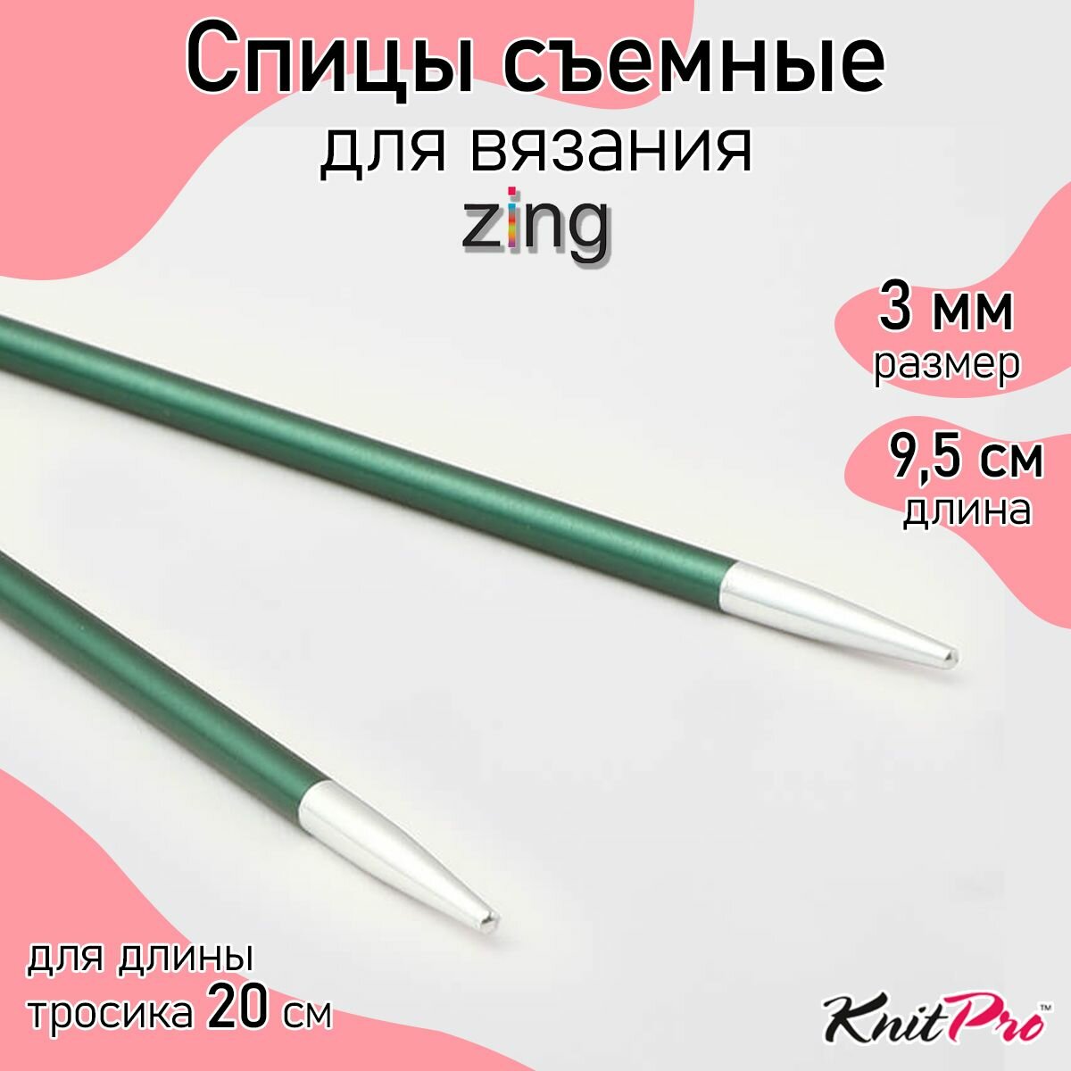 Купить 47528 Knit Pro Спицы съемные для вязания Zing 3мм для длины тросика 20см, алюминий, нефритовый, 2шт
