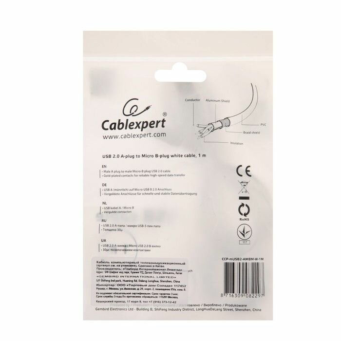 Кабель Cablexpert USB - microUSB (CCP-mUSB2-AMBM), белый